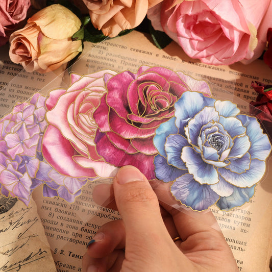 100 PCS Large Size Flowers Sticker with Gold Holographic Outlines for Journaling Supplies, Watercolor Floral Sticker for Scrapbooking, Aesthetic Room Decor Junk Journal Bullet Journals Collage