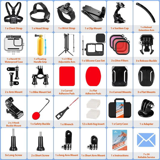 HONGDAK Action Camera Accessories Kit for GoPro Hero 13 12 11 10 9 Black, Waterproof Housing+Silicone Case+ Adjustable Arm+Head Chest Wrist Strap+Bike Mount+Suction Cup+Floating Grip Bundle Set 63in1