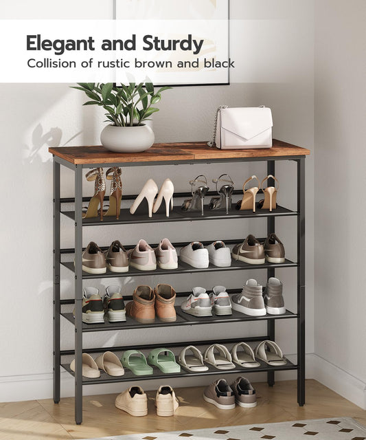 HOOBRO Shoe Rack for Entryway, 5-Tier Shoe Organizer with Adjustable Mesh Shelves, 16-20 Pairs of Shoes, Spacious Floor Mount, Metal, Industrial, Shoe Shelf for Closet, Rustic Brown BF12XJ01