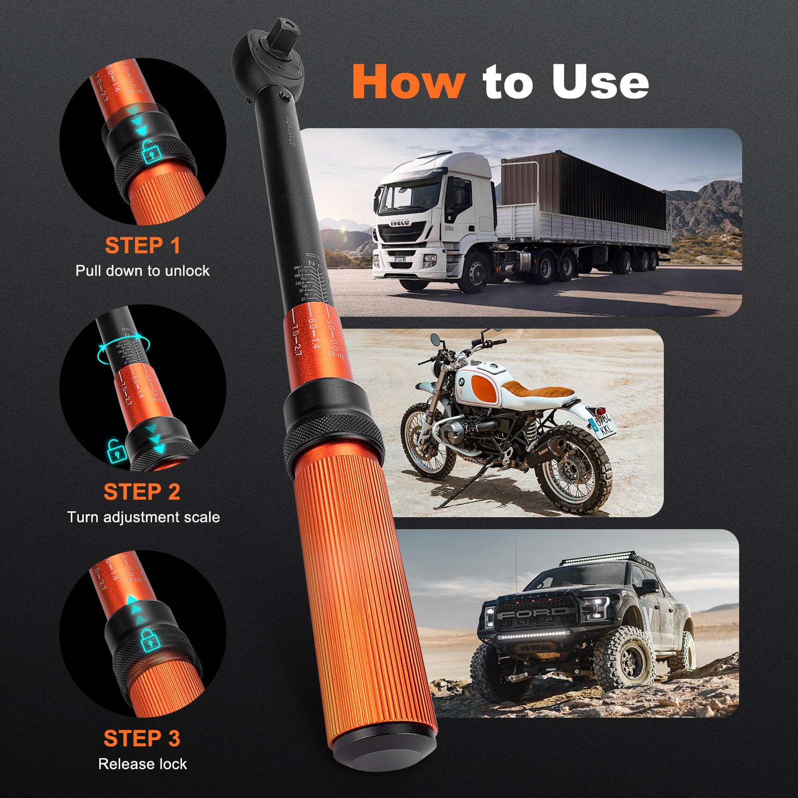 • High Precision: Within ±3% accuracy, our industrial-grade torque wrench 1/2 inch drive has dual torque range of 10-180 FT.LB / 13.6 -244.1 N.m, 1 FT.LB micro-adjustment, the torque wrench includes a precision-engineered graduation ring, securely locked to provide smaller incremental values. you can fine-tune torque settings to perfection, meeting the exact specifications of your tasks with ease