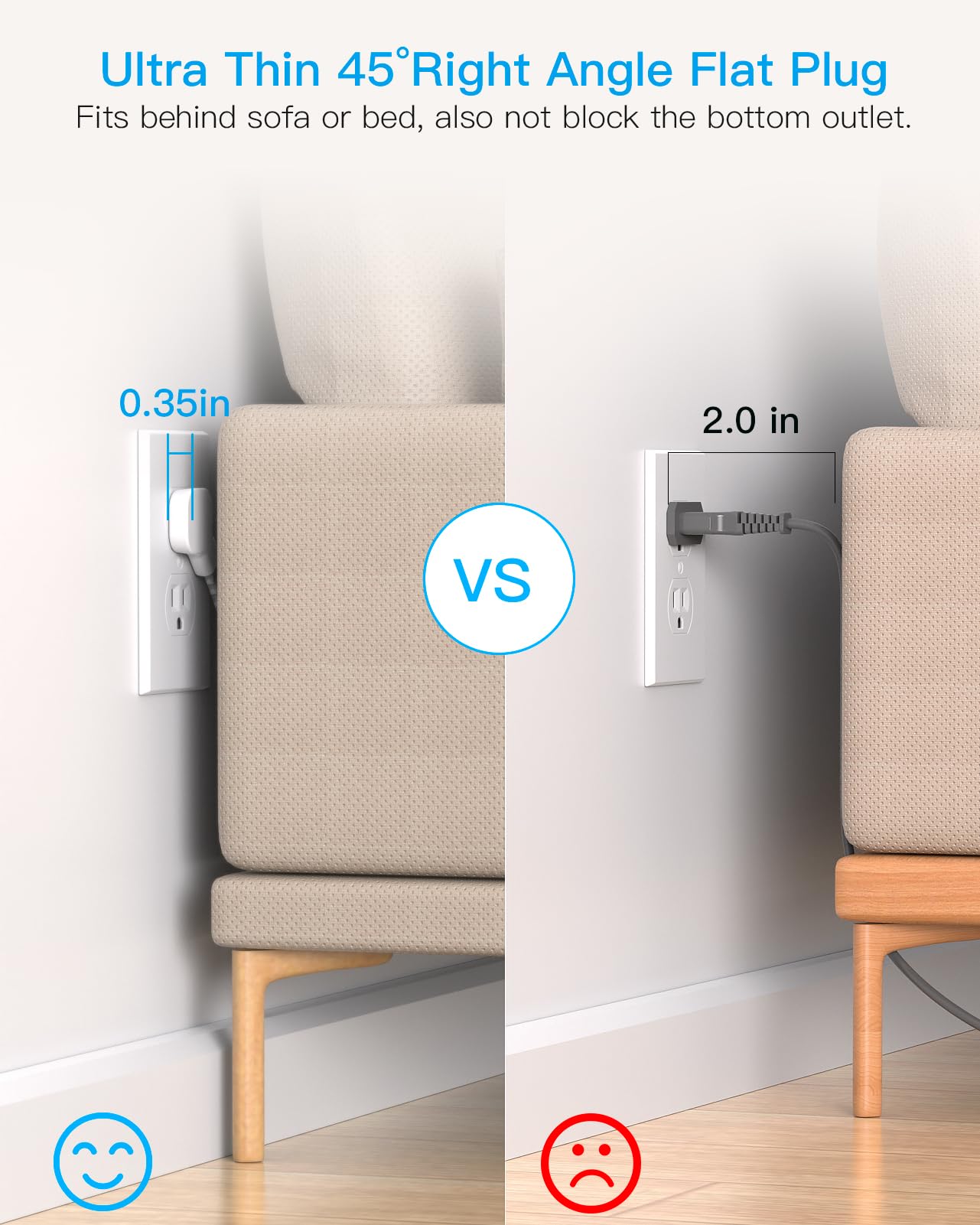 • 【10ft Flat Extension Cord & Ultra-Thin Plug】This 10-feet flat plug extension cord is designed for tight spaces, ideal for college dorm room, office, and home essentials. The ultra-thin 0.35-inch flat wall plug allows it to fit snugly against the wall, easily hidden behind furniture, beds, or refrigerators, thus maximizing your space. The 45° right-angle design of the low-profile flat plug ensures that the adjacent outlet remains accessible