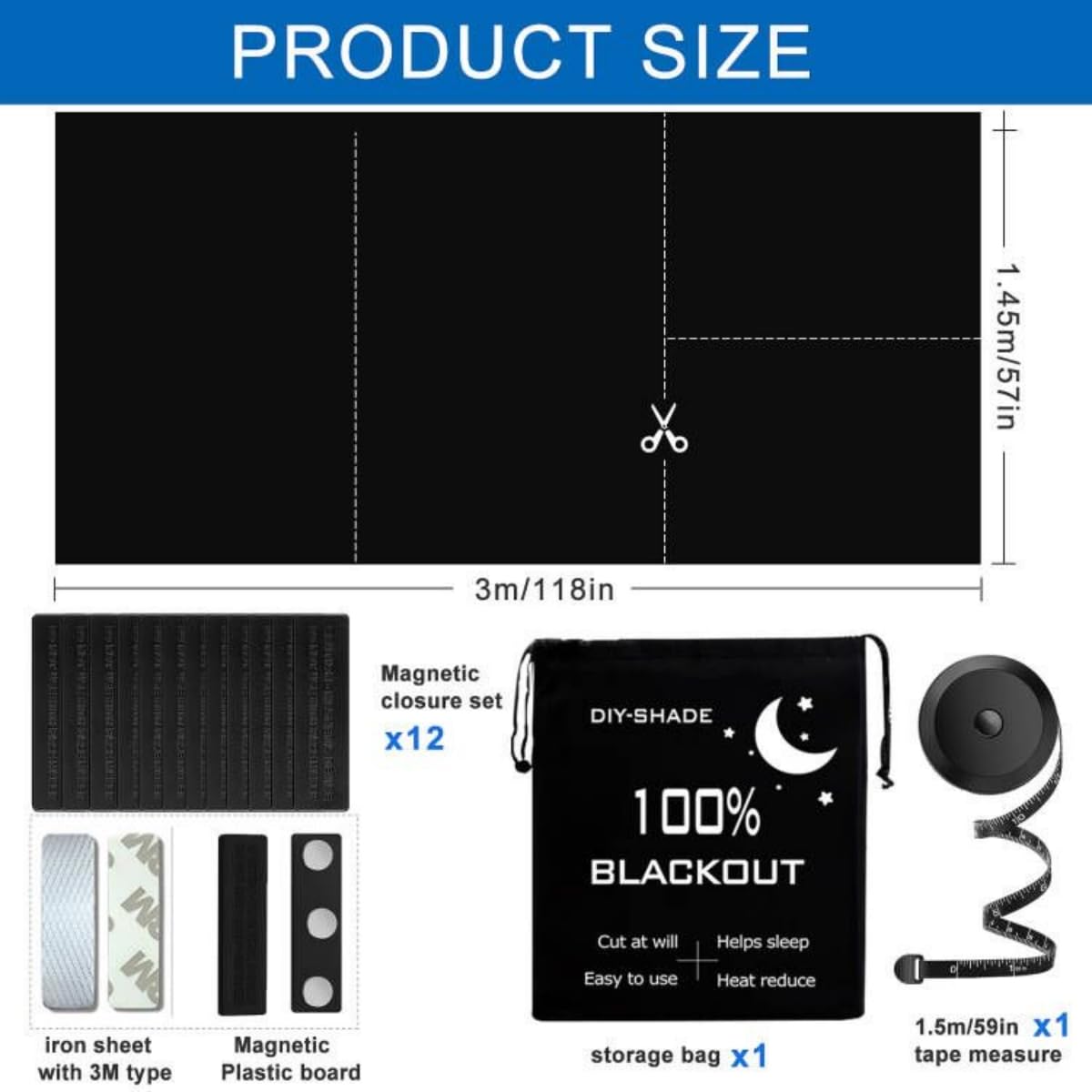 • 【Pack list and notice】You Can Get 1 Pcs 118'x57' Blackout Shades, 1 Pcs Soft Ruler, 12 Pair Magnetic Fasteners, 1 Pcs Storage Bag. Notice -The Magnets Actually Hold The Piece Of Fabric In Between Them Vs Actually Being Adhered To The Fabric,The Silver Metel Board With Adhesive, Eit Should Attached On The Window Frame And The Magnetic Board Without Adhesive, It Should Fix On The Blackout Blind Window Cover.