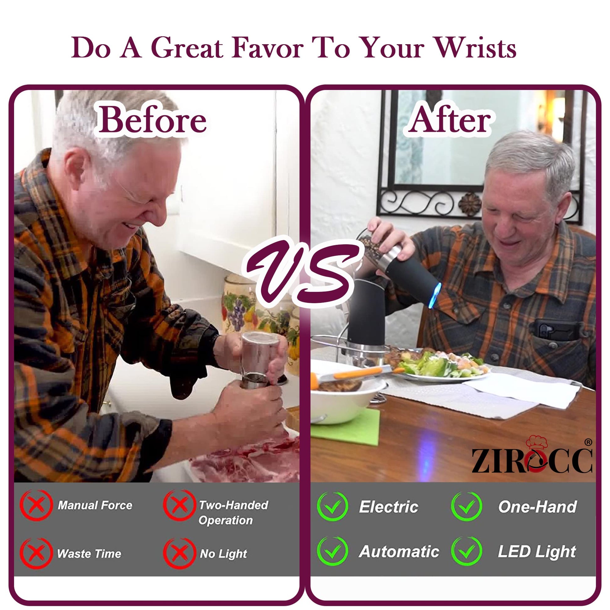 • DO A GREAT FAVOR TO YOUR WRISTS: Our Modern Gravity sensing innovative design provides automatic activation operation that ensures effortless dispensing without the touch of a button unlike other brands; the Automatic Pepper Grinder lights up when tilted; dispensing salt or pepper; which is ideal for people who suffer from Arthritis, Carpal tunnel and other dexterity issues.