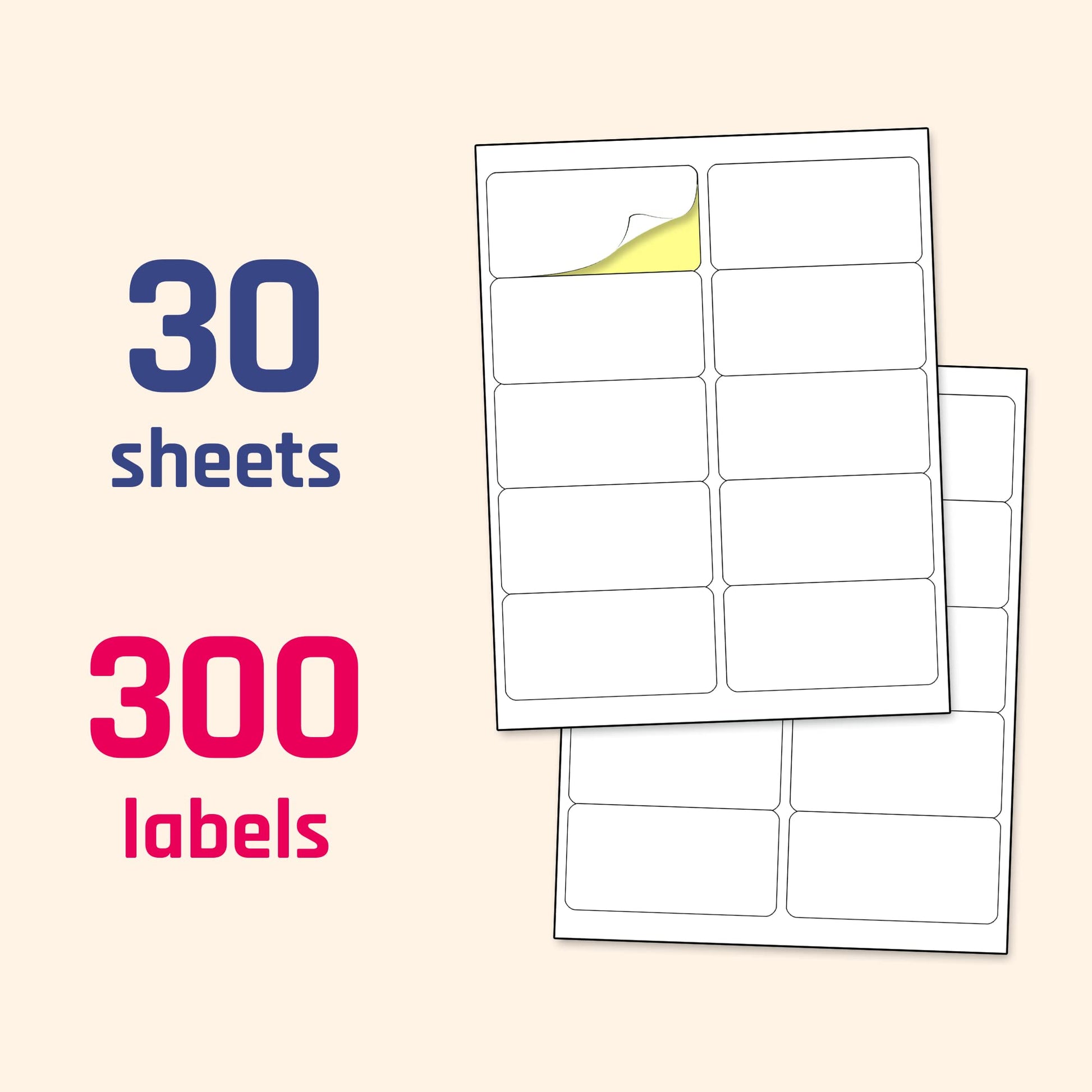• Label Size: 2' x 4', Sheet Size: 8.5' x 11'. 30 sheets, 300 labels.