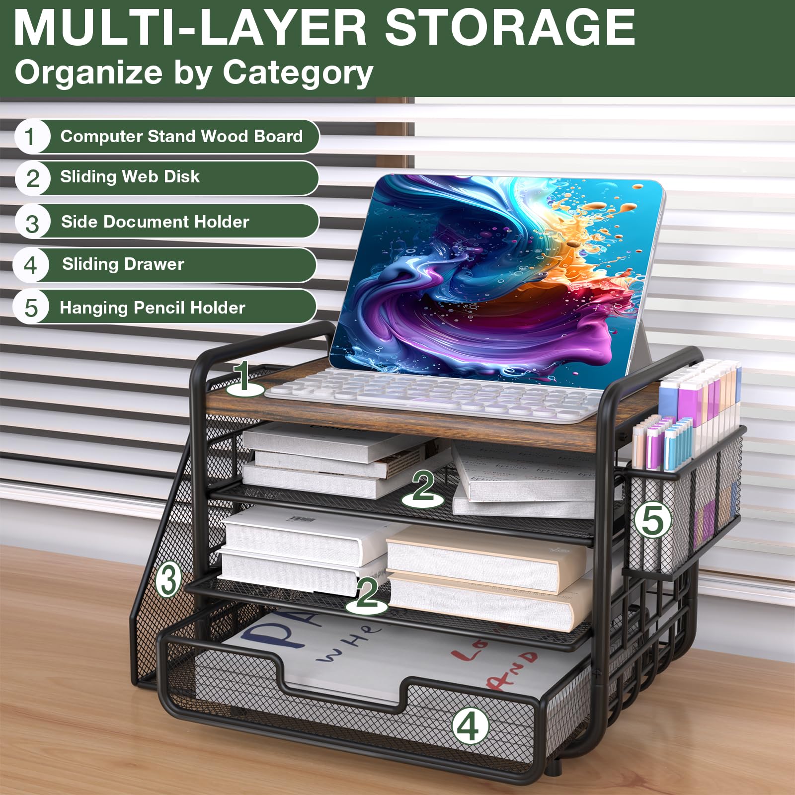 2025 New Large Capacity Desk Organizer with Drawer, Wooden 4-Tier Paper Organizer Letter Tray with File Holder and Pen Holders, Wooden Desk Accessories for A4 Paper Work Folder Storage (Style1)