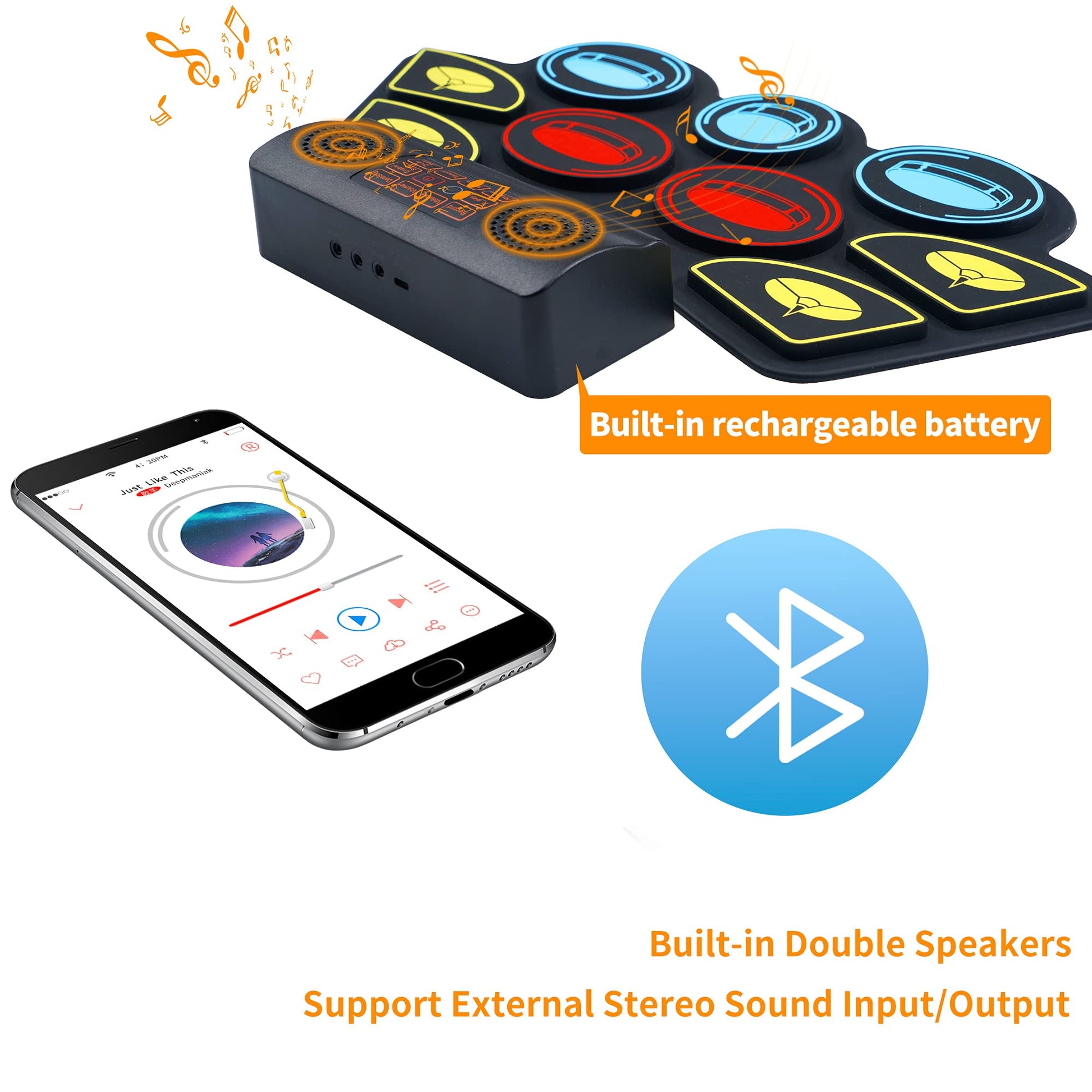 (9 Pads) Electronic Drum Set with Light Up Drumsticks and Stand, Electronic Drum Pad with 5 Different Drum Kit, 10 Unique Rhythms, Bulit-in Double Speakers, Roll Up Drum Kit, Kids Drum Set