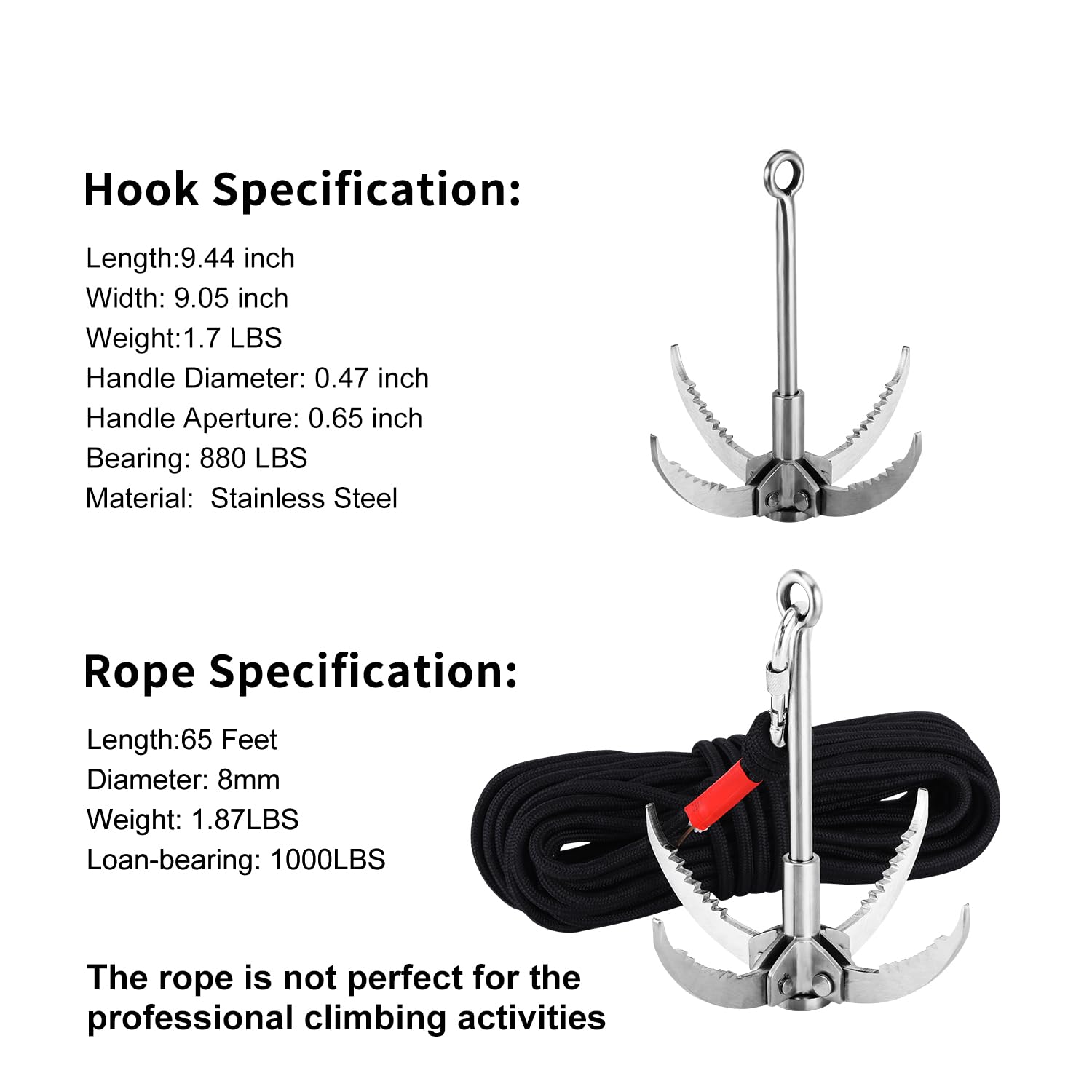 Ant Mag Grappling Hook Stainless Steel Claw Carabiner with 20m/65ft 8mm Auxiliary Black Rope for Camping Hiking Tree Grabbing and Water Lifting Salvage