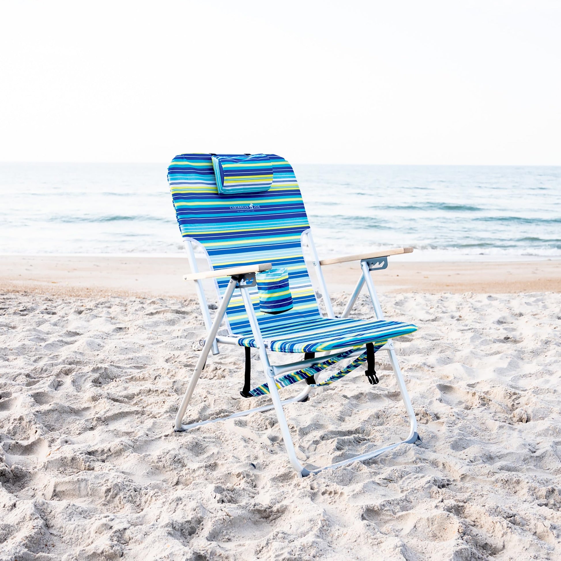 Caribbean Joe Folding Beach Chair, 4 Position Portable Backpack Foldable Camping Chair with Headrest, Cup Holder, and Wooden Armrests, Blue and Lime Stripe