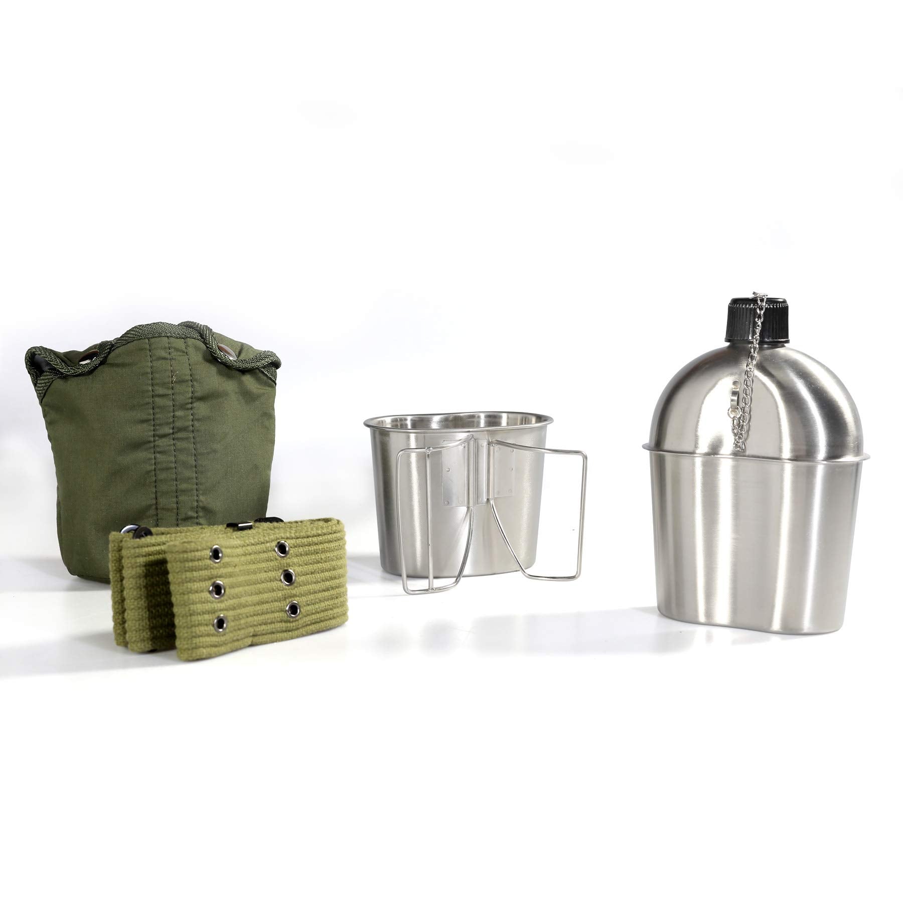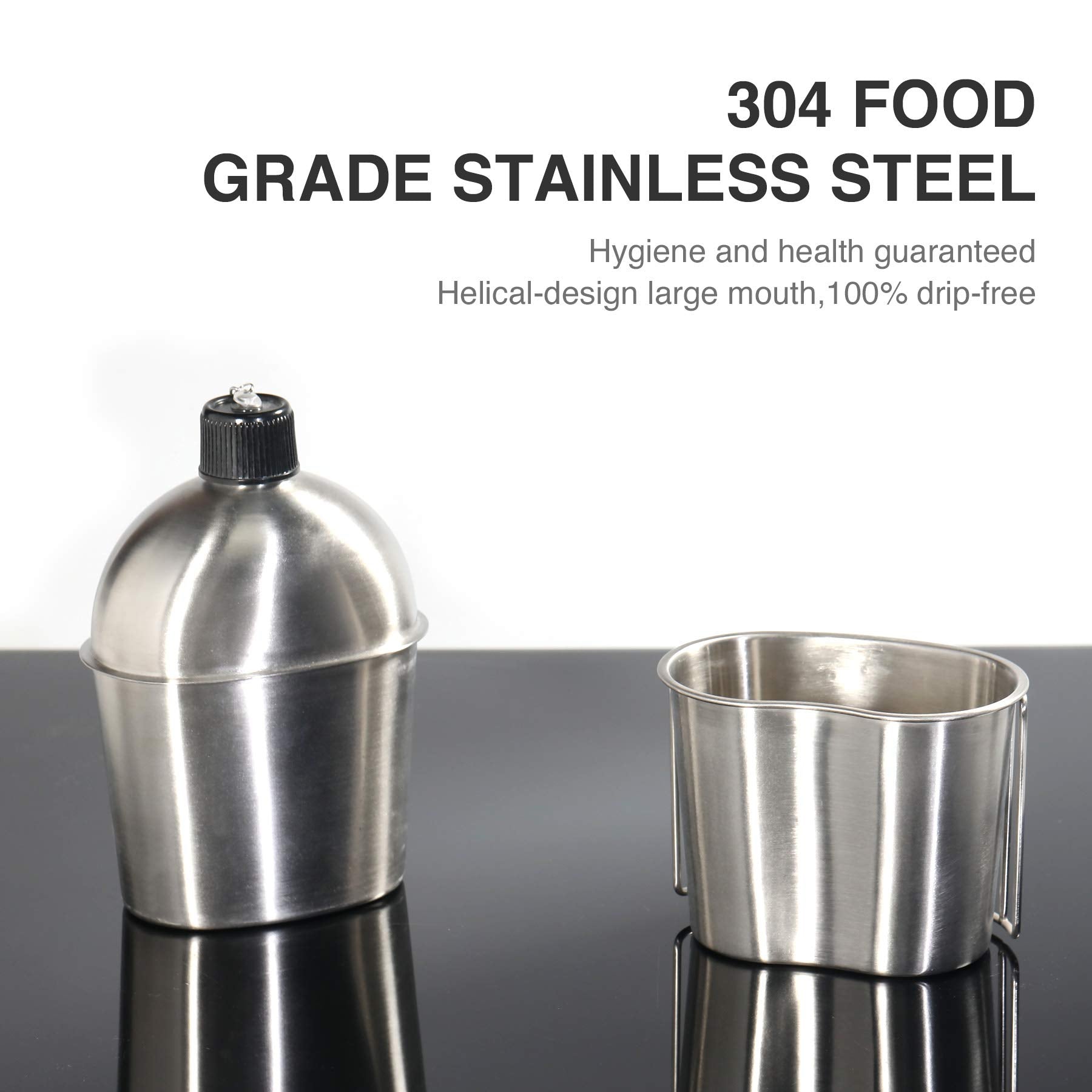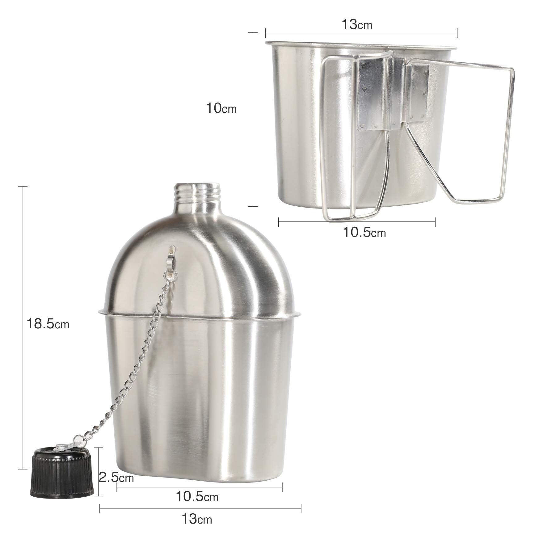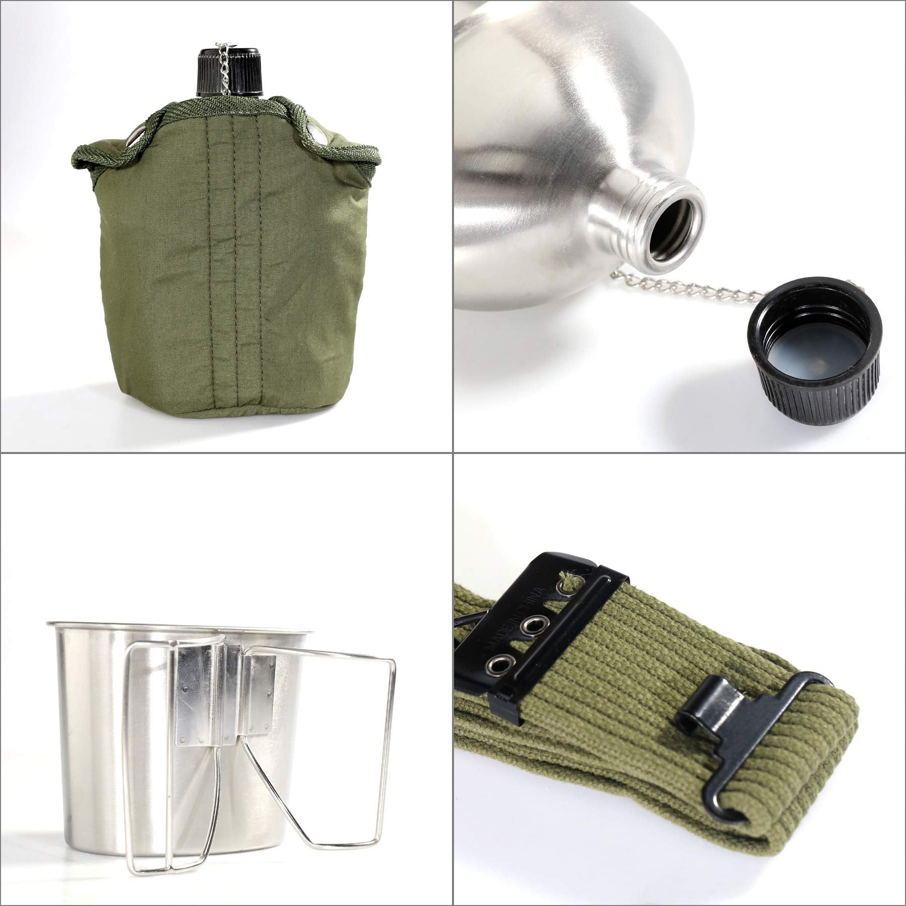 • CUP AND BELT INCLUDED: A stainless steel cup with a foldable handle fits snugly along the bottom of the metal canteen. This canteen cup can be used to collect water and can directly be set on a fire to boil water or cook meals. The belt that's included is the optimal device for connecting the canteen to yourself or another object.