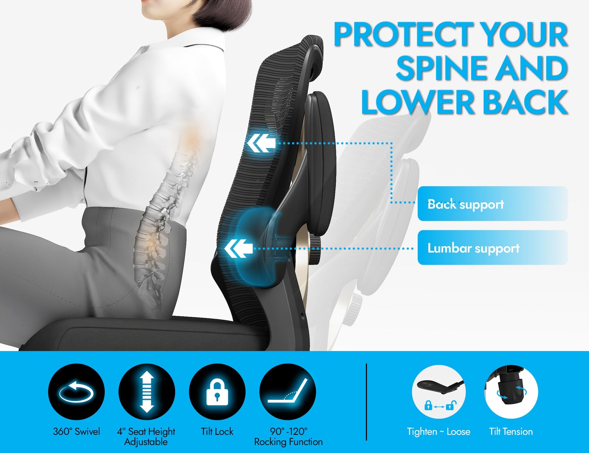 • Comfortable Breathable Mesh Seat: This office chair offers a spacious seating area, accommodating various body types. Overall dimensions (including arms): 25.7' W x 17.3' D x 46.9.3'-49.2' H, Seat dimensions: 20' W x 17.3' D x 18.5'-3' H. It can support up to 330 lbs. Its unique recline function allows you to tilt the backrest (90~120°) or sit upright freely, ensuring your comfort and relaxation