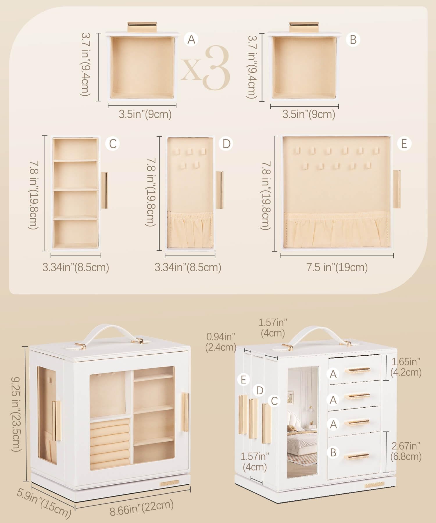 • Thoughtful Details: The jewelry holder box includes a mirror for easy dressing and big gold handles for convenient drawer sliding. Sized at 5.9 x 8.66 x 9.25 inches, this jewelry organizer case fits perfectly on your dresser or vanity