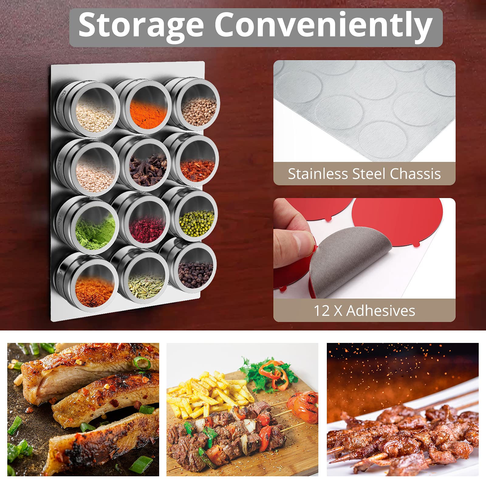• 🔗 【12-Pack Magnetic Spice Jars】430 Stainless Steel with Dual-Dispensing Lids---:100ml (3.4oz) airtight containers feature 2 adjustable pouring holes - switch between fine sprinkle or free-flow pouring. Durable-grade 430 stainless steel resists corrosion & never rusts.