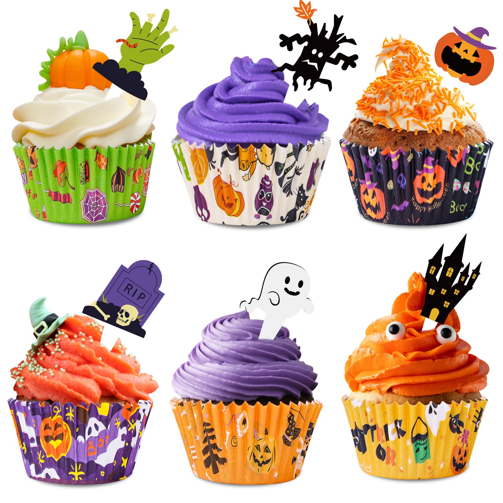 Homyplaza Halloween Cupcake Liners with Toppers Picks, Standard Wrappers Cupcake Disposable Baking Cups Muffin Liners for Halloween Party Decorations Supplies (150 Liners & 150 Toppers)