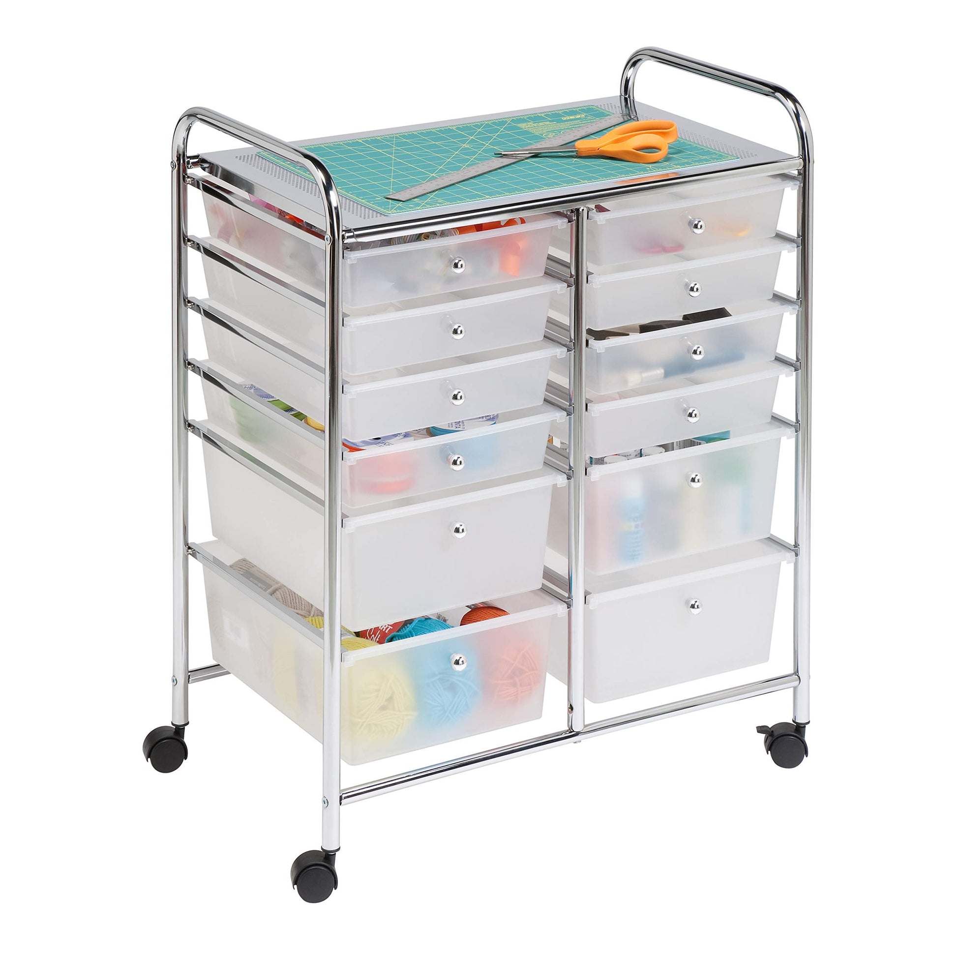 Honey-Can-Do CRT-01683 12-Drawer Studio Organizer Cart, Chrome. Perfect for the home, classroom, or art studio, this double-wide organizer features 12 easy-access drawers. The semi-transparent plastic drawers allow you to quickly identify drawer contents. Clamp it down with honey can do!