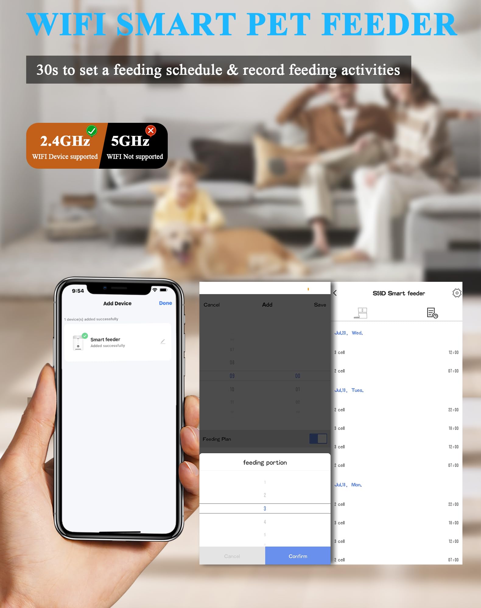 • 【WiFi Automatic Cat Feeders - APP Remote Controls Feeding】The cat automatic feeder connects fast and stably to 2.4GHz network via bluetooth permission. It only takes 30 seconds to set a feeding schedule on the app, which is much easier than using the button model. You can feed your pets anytime, anywhere on your smartphone and view the feeding log on App to make sure the automated cat feeders is working as scheduled.