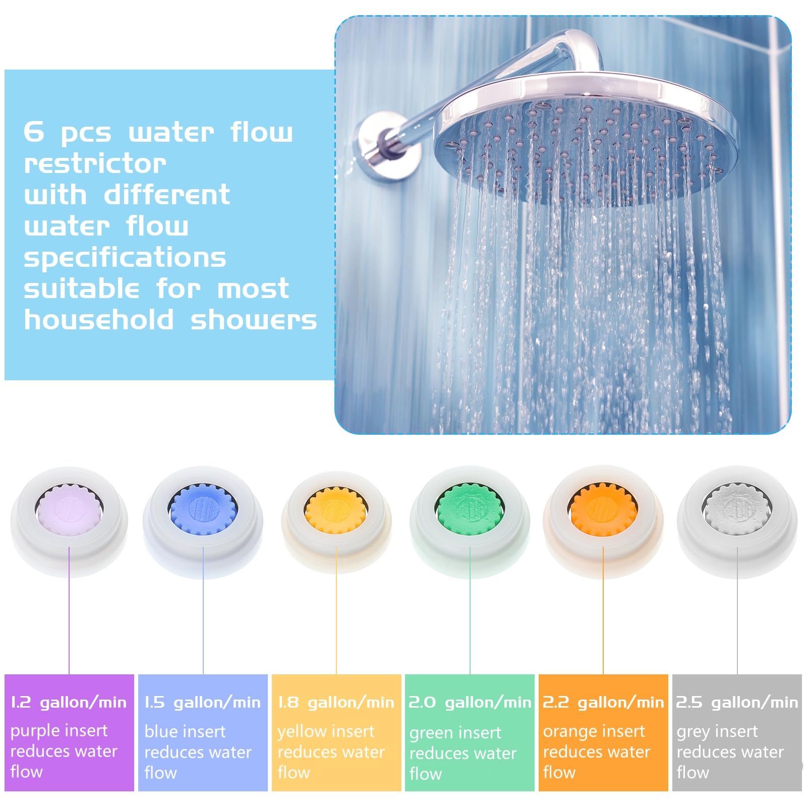 • Nice combination: package comes with a1/2 NPT restrictor valve and 6 pieces water flow restrictors with different water flow specifications and in various colors,1.2/ 1.5/ 1.8/ 2/ 2.2/ 2.5 GPM; shower pressure reducer,can choose suitable one to apply