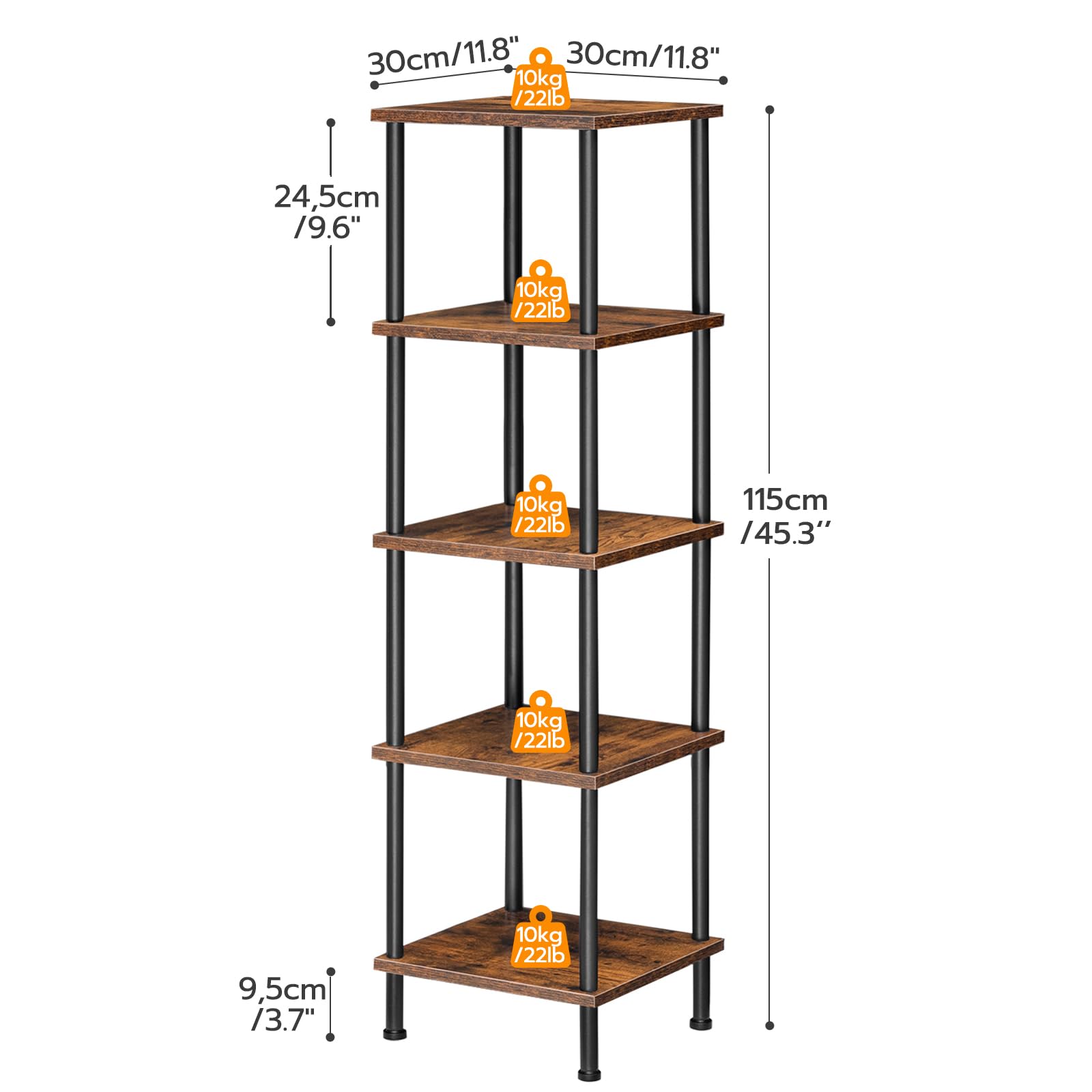 HOOBRO 5-Tier Corner Shelf Stand, Corner Square Rack Display Shelf, Tall Storage Plant Stand, Bookcase for Small Spaces, Living Room, Home Office, Kitchen, Rustic Brown and Black BF50CJ01