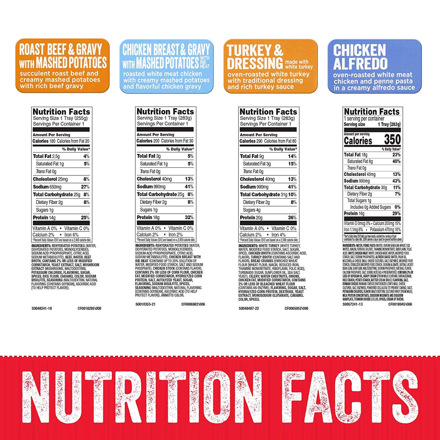 • HORMEL COMPLEATS Protein Variety Pack: This variety pack includes 1 each of our high protein Trays: Chicken Alfredo, Turkey and Dressing, Chicken and Mashed Potatoes, plus 2 Roast Beef and Mashed Potatoes