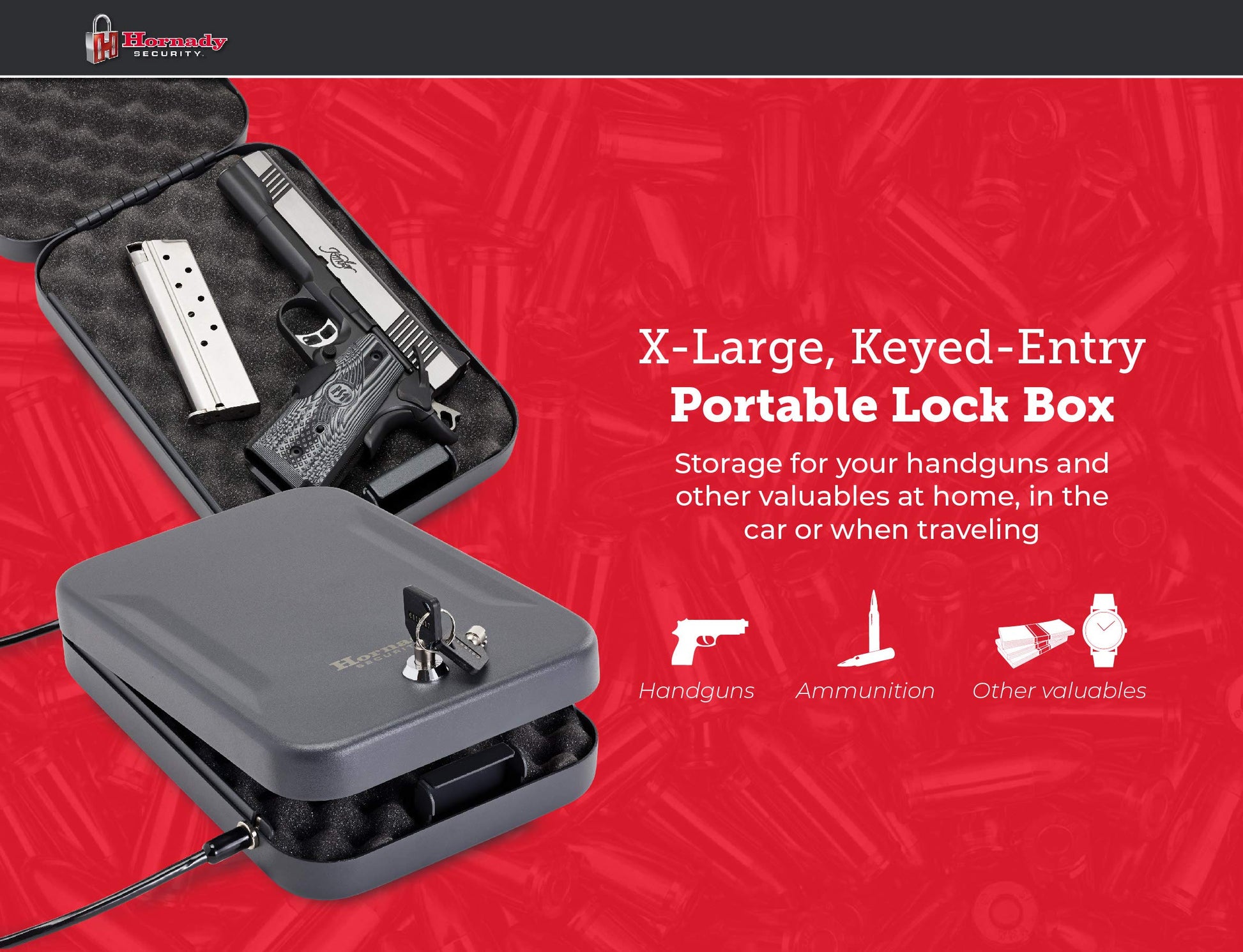 • Hornady Lock Box – Store your firearm and valuables with confidence. This extra large locked storage box provides a safe and secure place for your handguns and other valuables at home, in the car or when traveling