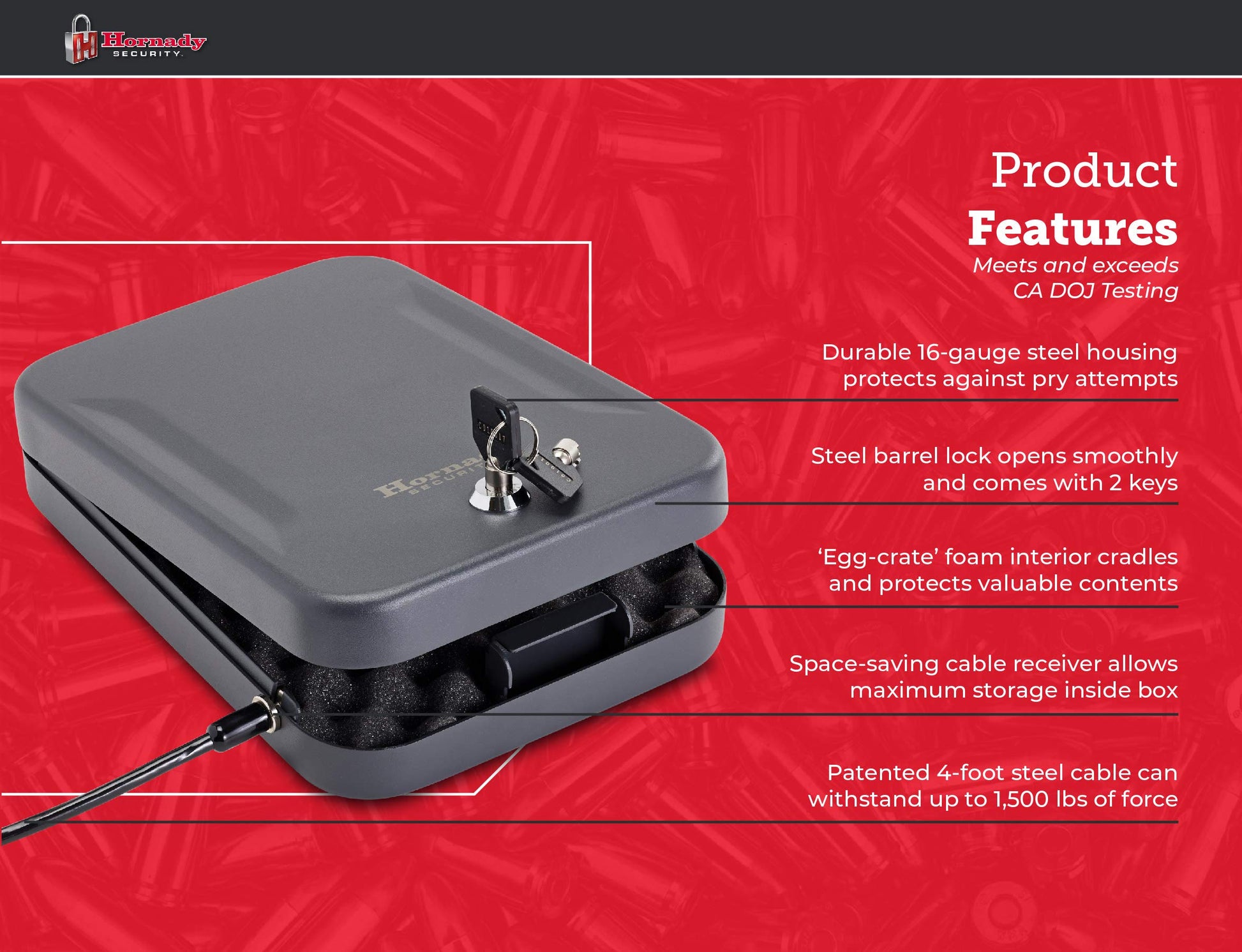 • Heavy and Sturdy – This Hornady safe is made from 16 gauge steel. Comes with a heavy duty 1500 lb. steel lock-down cable that attaches the portable safe to any stationary object, including a vehicle seat or heavy piece of furniture