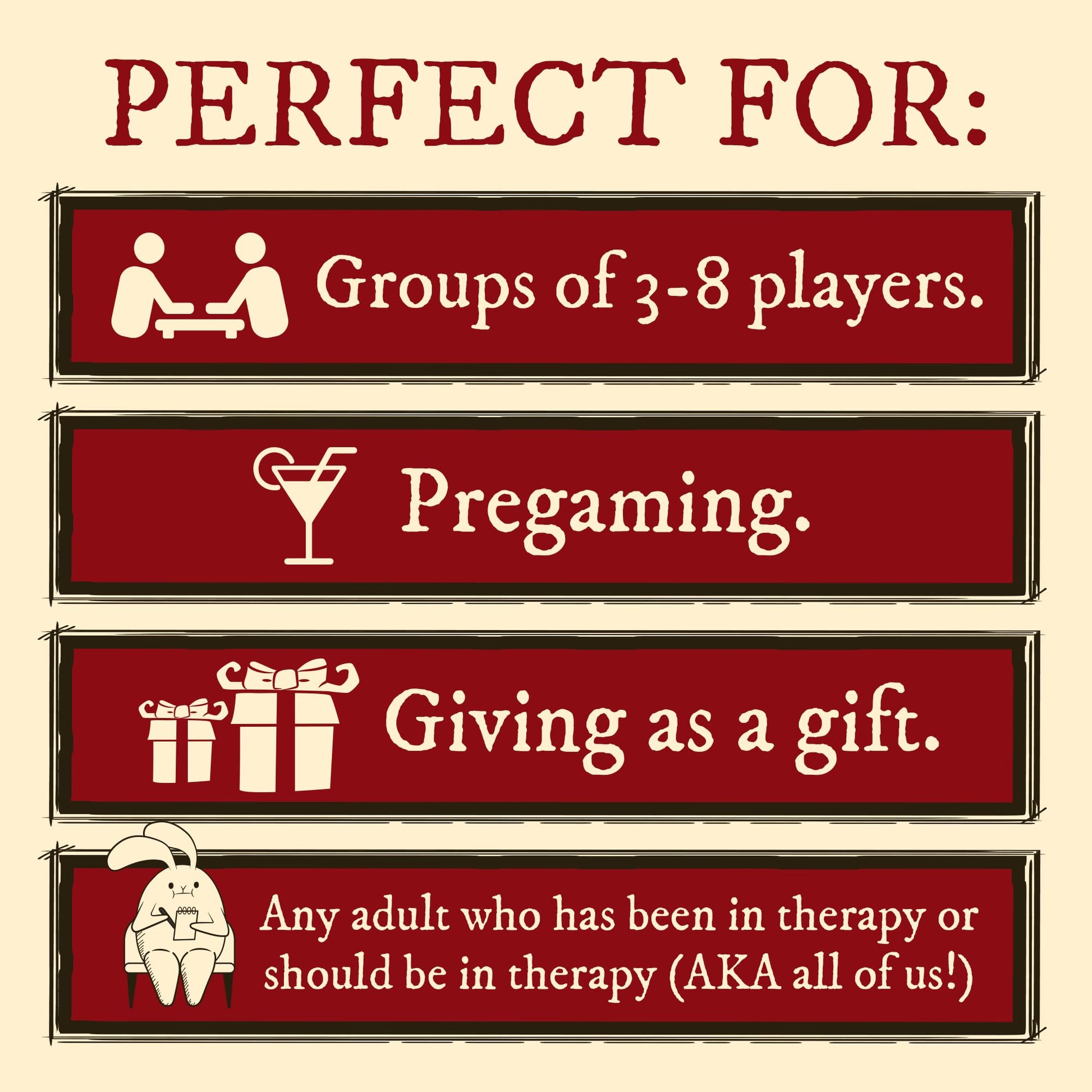 Where to Play: WANT TO BREAK THE ICE AT PARTIES? This is a card game for adults that’s great for pregaming, large gatherings, road trips, vacations, or for giving as a gift to anyone who appreciates a funny card game (or who needs therapy!). Perfect for all adult party games and games for adults.