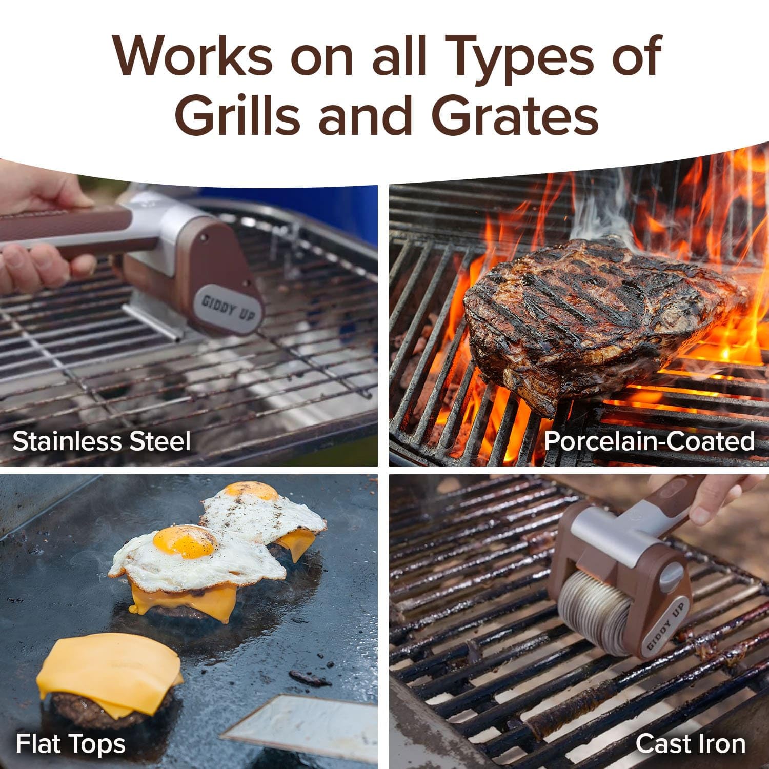 • NO BRISTLES, NO MESS: Ditch dangerous wire brushes. Giddy Up uses a solid stainless steel roller to power through char without shedding bristles that can end up in food