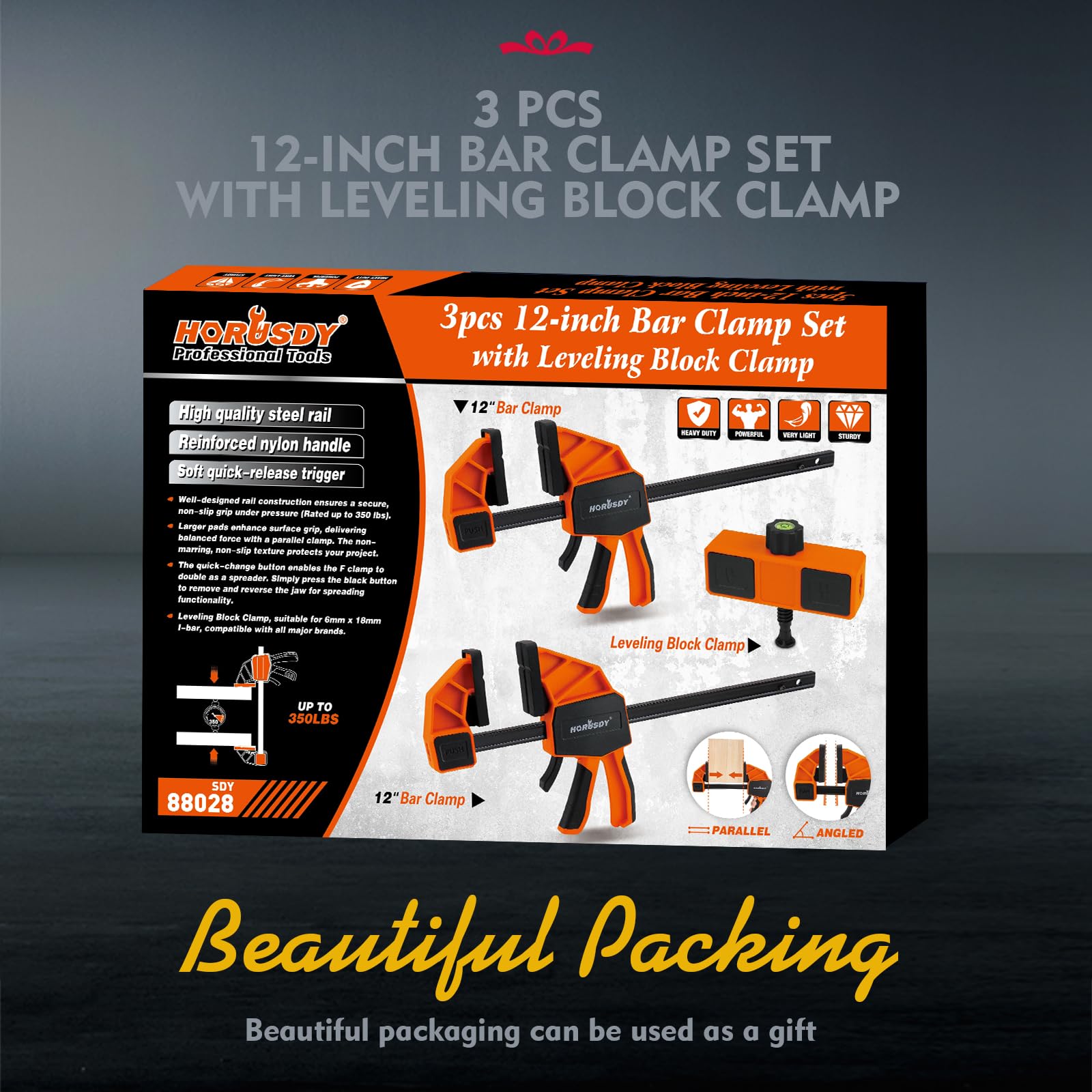HORUDSY 3-Pack 12-Inch Bar Clamps Set with Leveling Block Clamps, Heavy Duty 350LBS Load, One-Handed Quick Grip Woodworking Clamps, Expandable Spreader with Connector