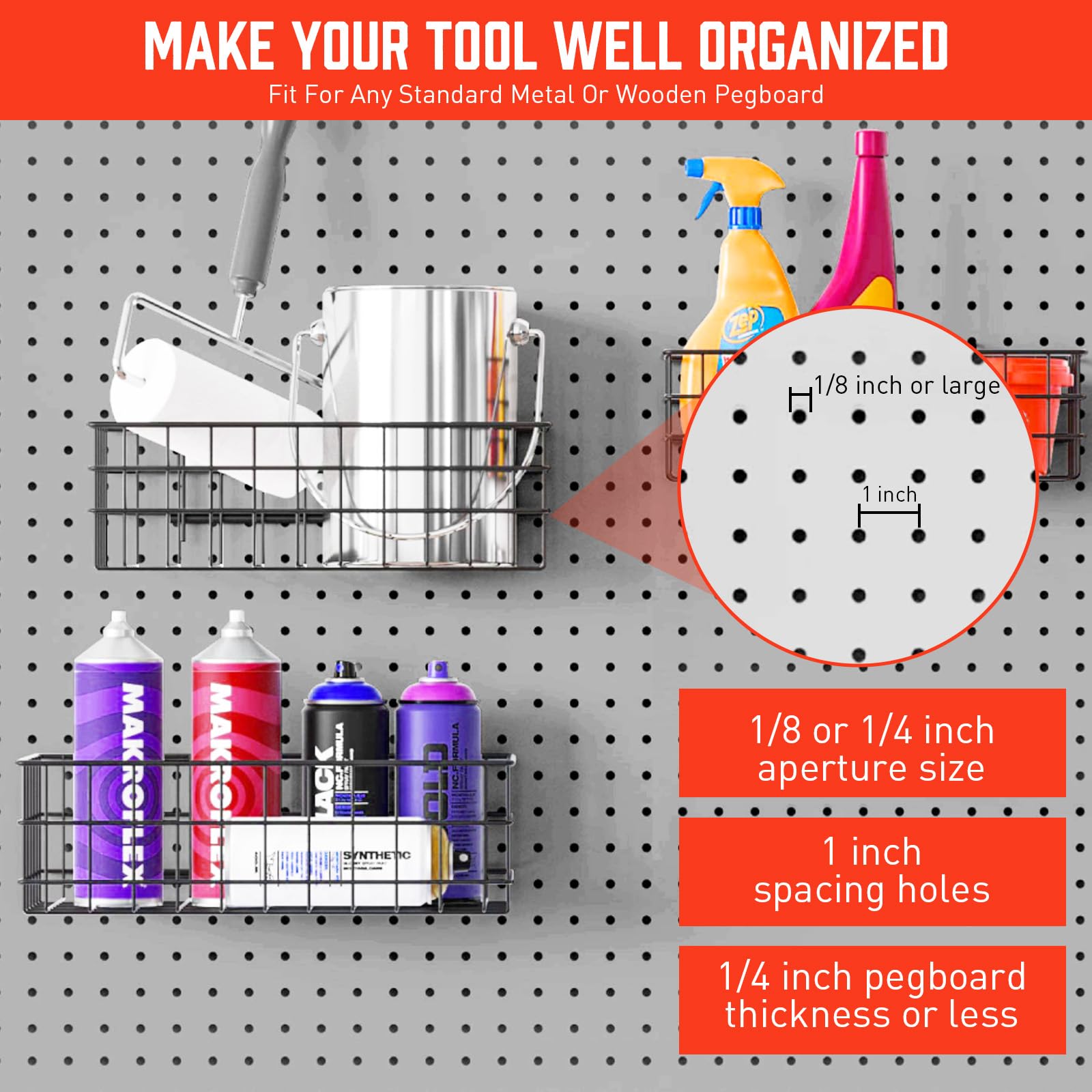 • Product includes 4 different size pegboard Baskets , S (6 x 3 x 2 inch) , M (8 x 4 x 3.5 inch) , L (12 x 6 x 3.5 inch) , XL (13 x 7 x 4 inch), each pin board basket can hold 30lbs.