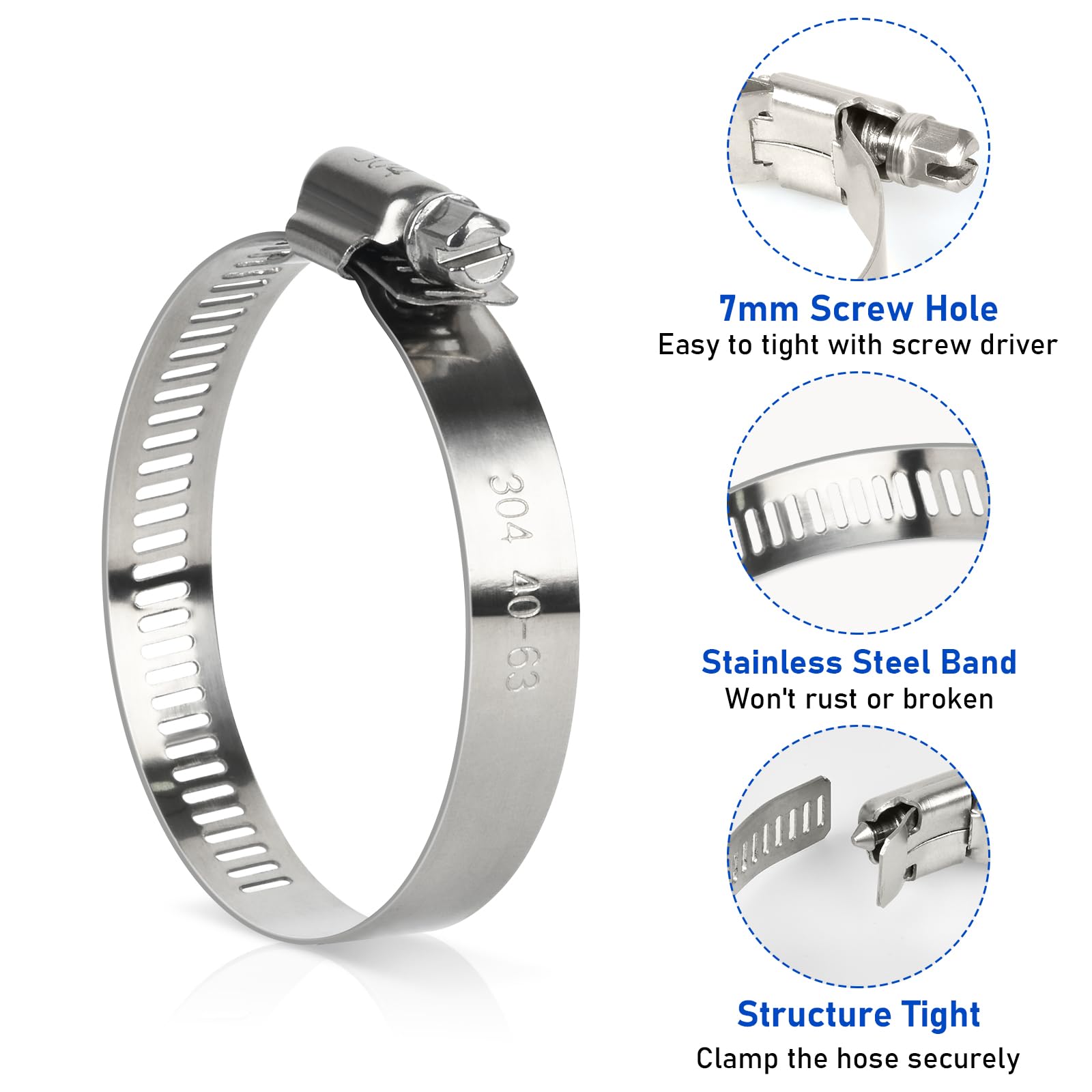 • High Quality --- Stainless steel hose clamps are all made of thick SUS 304 stainless steel (including band, housing and screw), have the features of corrosion-resistant, anti-rust, salt resistant, waterproof and oil proof. Hose clamp kit, durable and reusable, no longer worry about rusting and breaking when used in indoor and outdoor places.