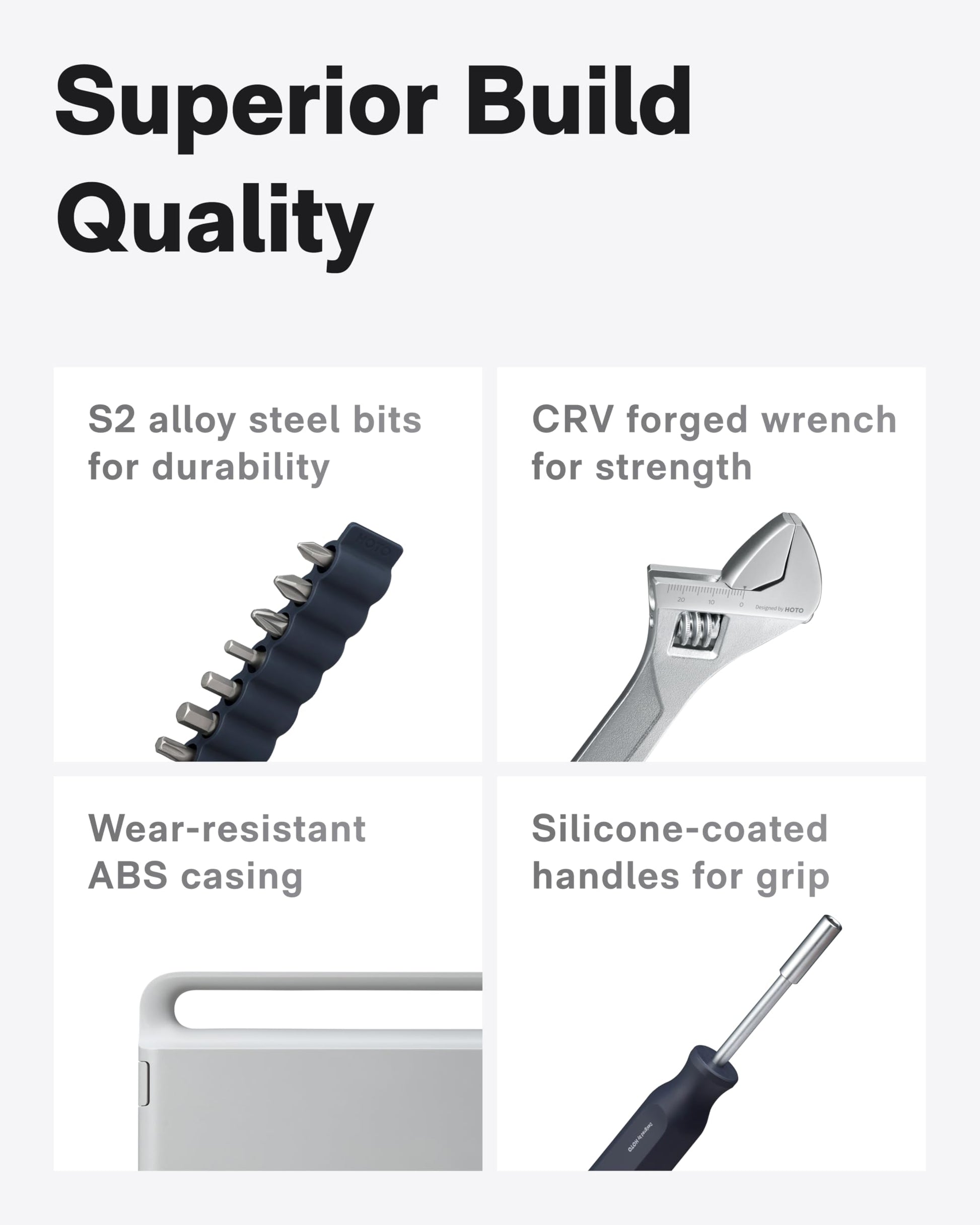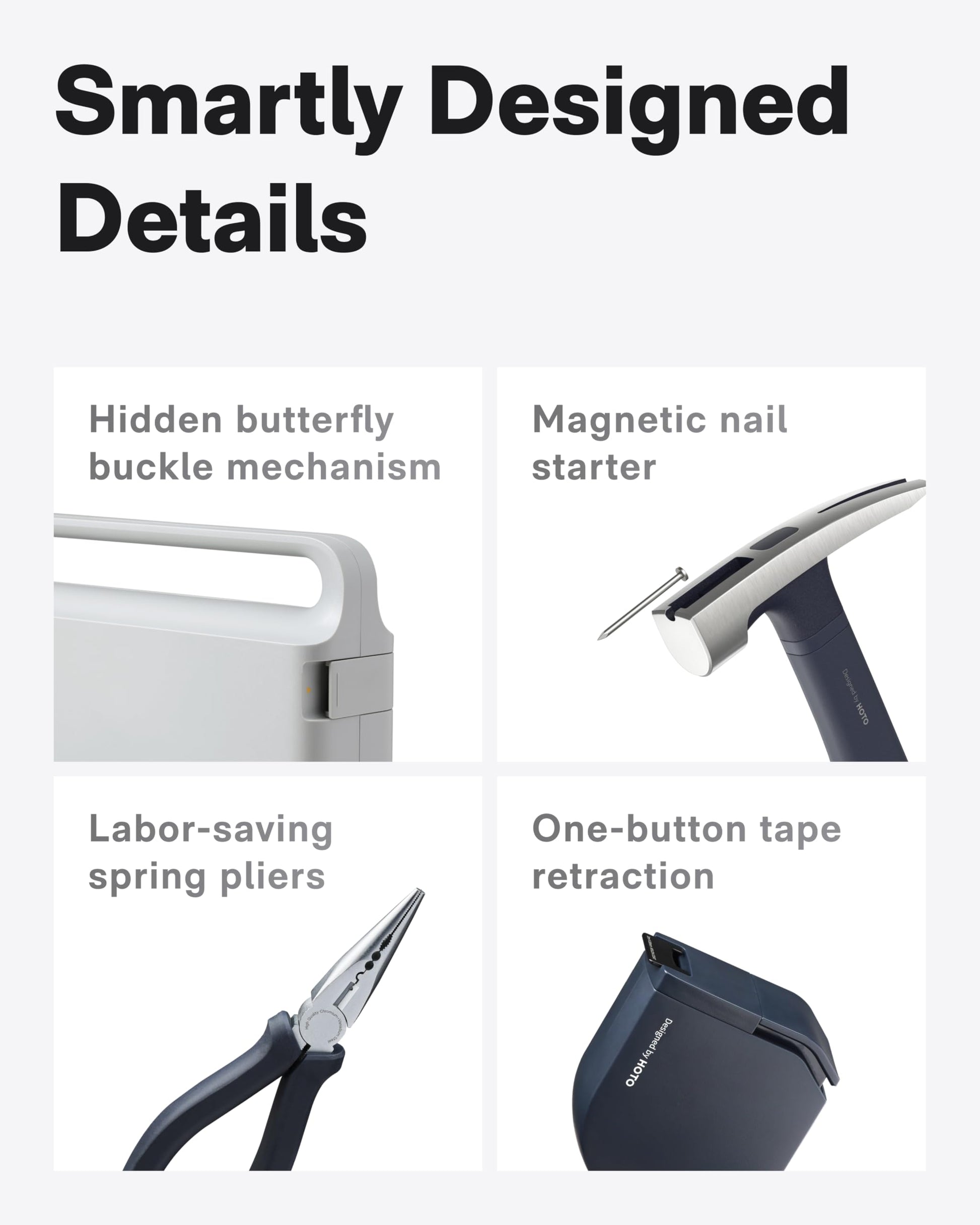 • OUTSTANDING APPEARANCE: The HOTO tool set, with its minimalist and innovative shape, is precisely designed. The sophisticated designed details enrich the visual and tactile sensations. The toolbox is equipped with an integrated design, smooth surface, fine texture, and neat interior. There is a Tough ABS material outer case, wear-resistant, and hidden side buckles which bring a smooth and neat buckle opening experience