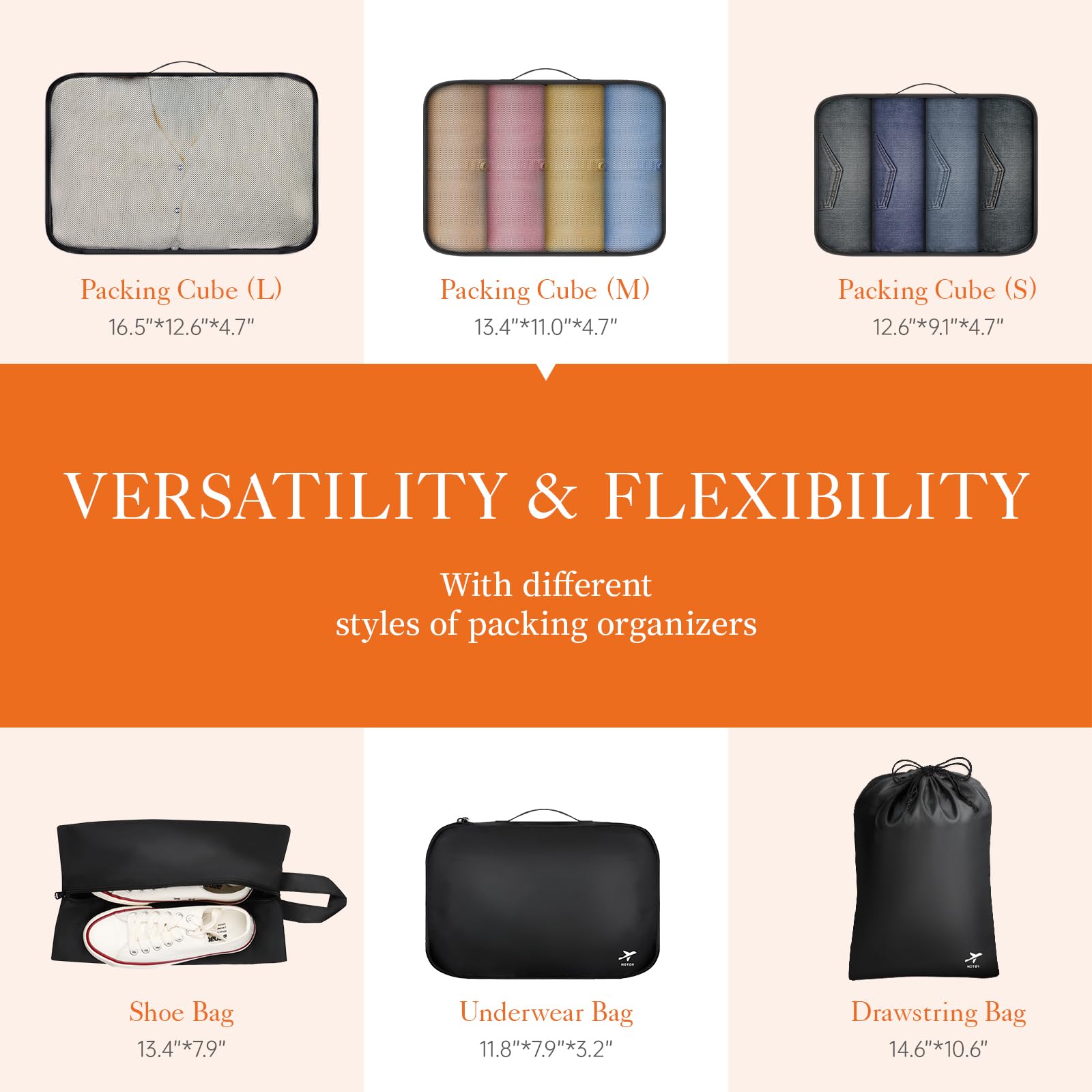 • VERSATILE & FLEXIBLE: HOTOR travel cubes for packing feature 6 different sizes and styles of organizers for different items: 3 mesh bags, 1 shoe bag, 1 drawstring pocket, and 1 underwear bag. Moreover, these packing cubes can be used to stay organized at home, while traveling, and are perfect for camping or any outdoor adventure! You can easily fit them into your suitcases, totes, backpacks, duffel bag, etc.