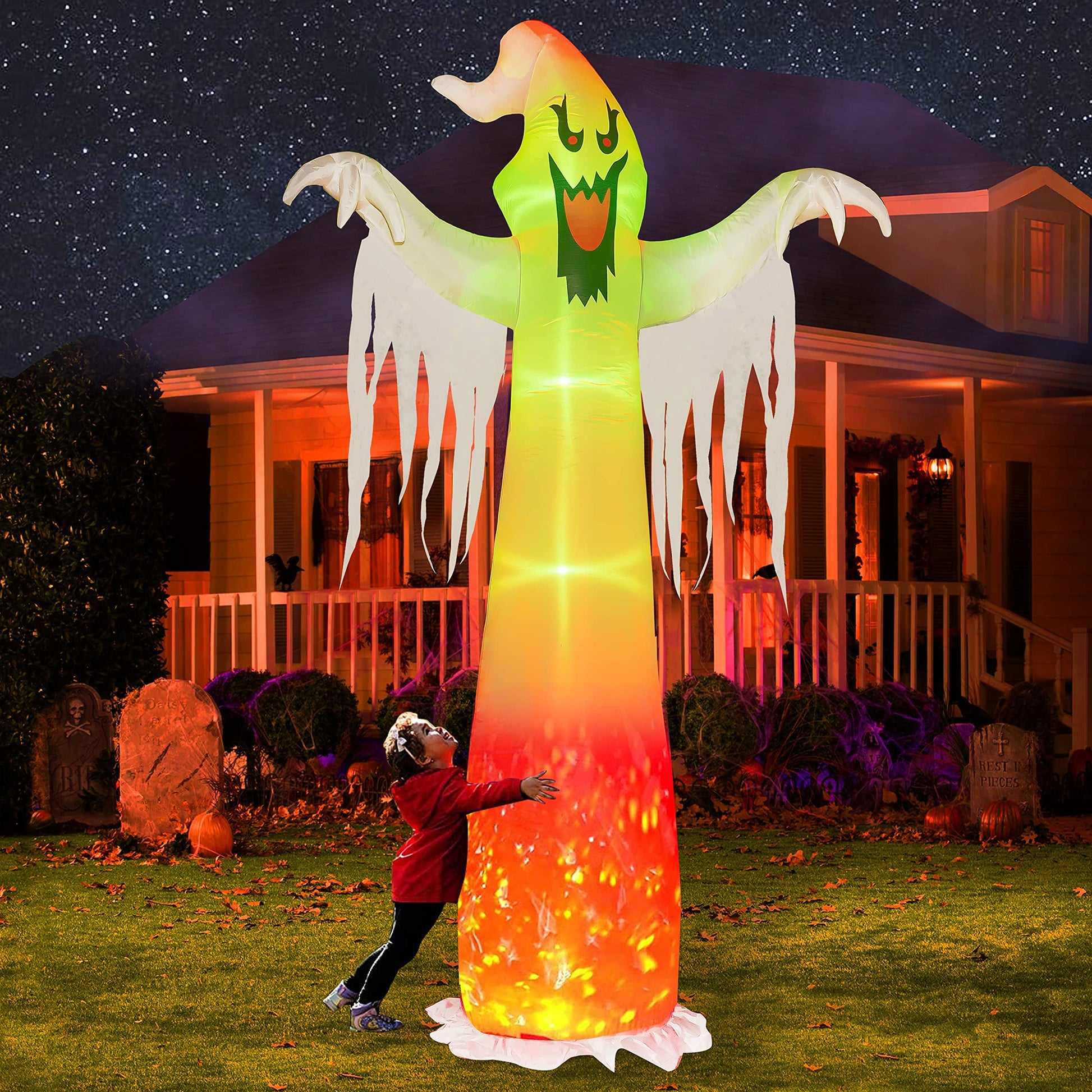 • Horror Halloween Ghost: Hourleey Halloween ghost has been designed with 3 LED lights and flame lamp built inside. When night falls, the terrible ghost seems to be burning with flames, adding to the terrifying atmosphere of Halloween.