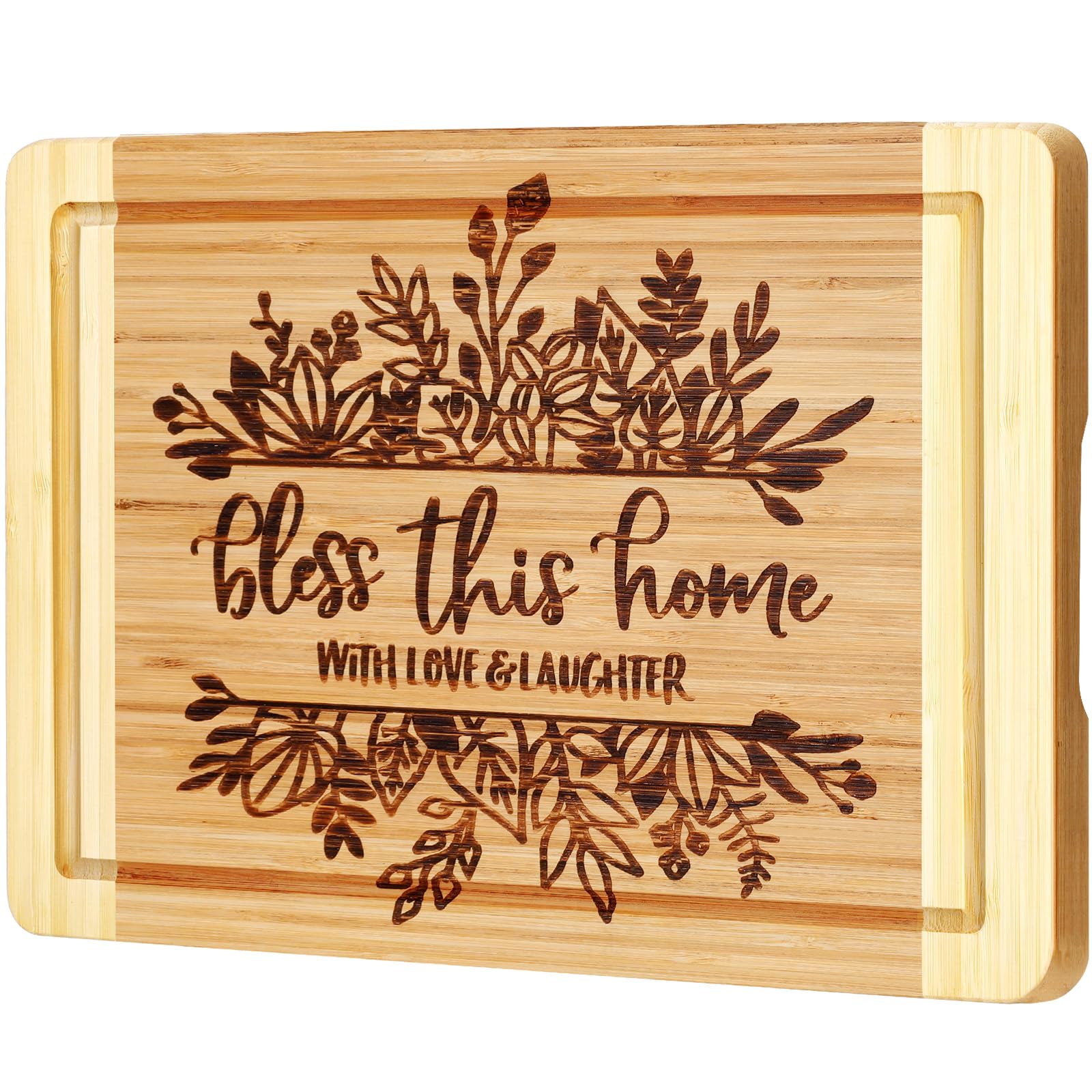 • Unique House Warming Gift New Home: Hunting for an unforgettable housewarming gift? Our bamboo cutting board, with its laser-engraved “bless this home with love & laughter”, is a true standout. It's a beautiful addition to any kitchen, whether displayed as a decorative piece or used for daily meal prep. This cutting board is sure to become a cherished item, making it an unforgettable gift for christian families, family, friend, couple, and gracious hosts