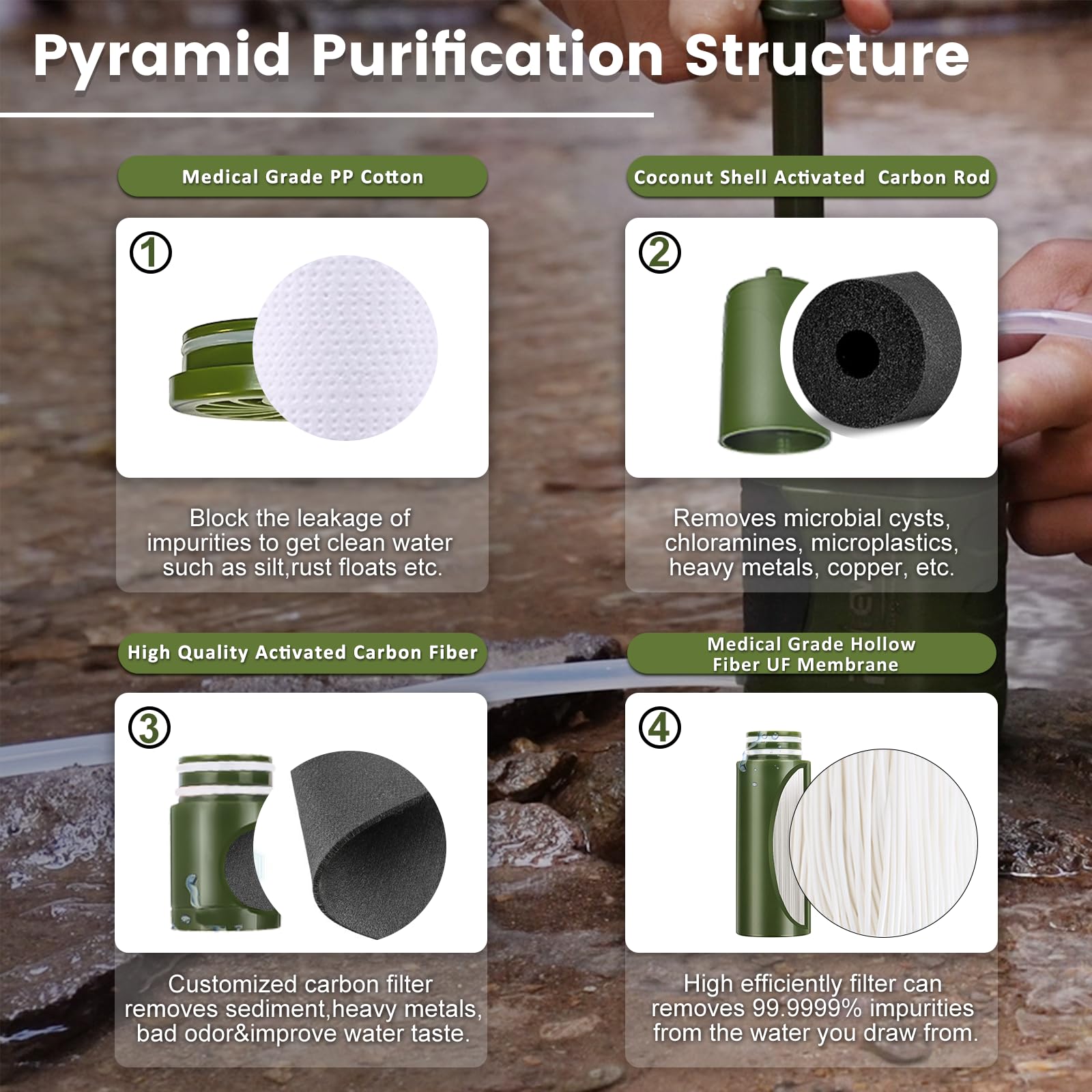 • ✔️WATER FILTER FOR CAMPING: 1. High-performance medical Grade Hollow Fiber UF Membrane, 2. High Quality Activated Carbon Fiber, 3. Coconut Shell Activated Carbon Rod, 4.Medical Grade PP Cotton. It's portable which makes it the perfect solution of water shortage in an emergency, and can instantly turn a water source nearby into healthy drinking water. Must for traveling, backpacking, camping and emergency kits!