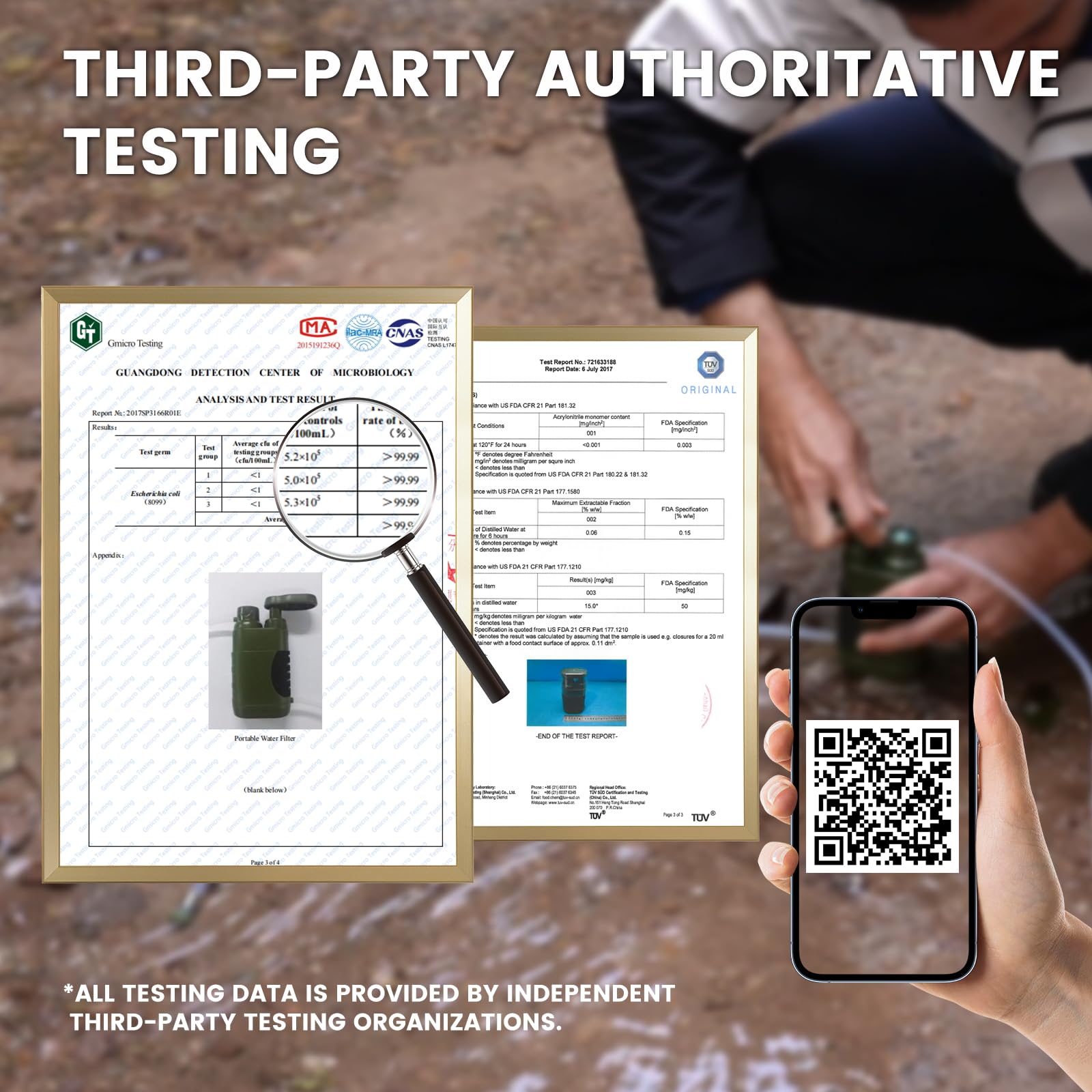 • ✔️ EMERGENCY WATER FILTER: The outdoor pump water purifier system uses 0.01 micron hollow fiber ultrafiltration membranes that reduce up to 99.9999% of fluoride, arsenic, chlorine, lead, most heavy metals, odors, chemicals and other trace substances. Passed SGS, NSF/ANSI international laboratory tests, the material meets FDA food grade standards, which ensures healthy drinking even in the field!
