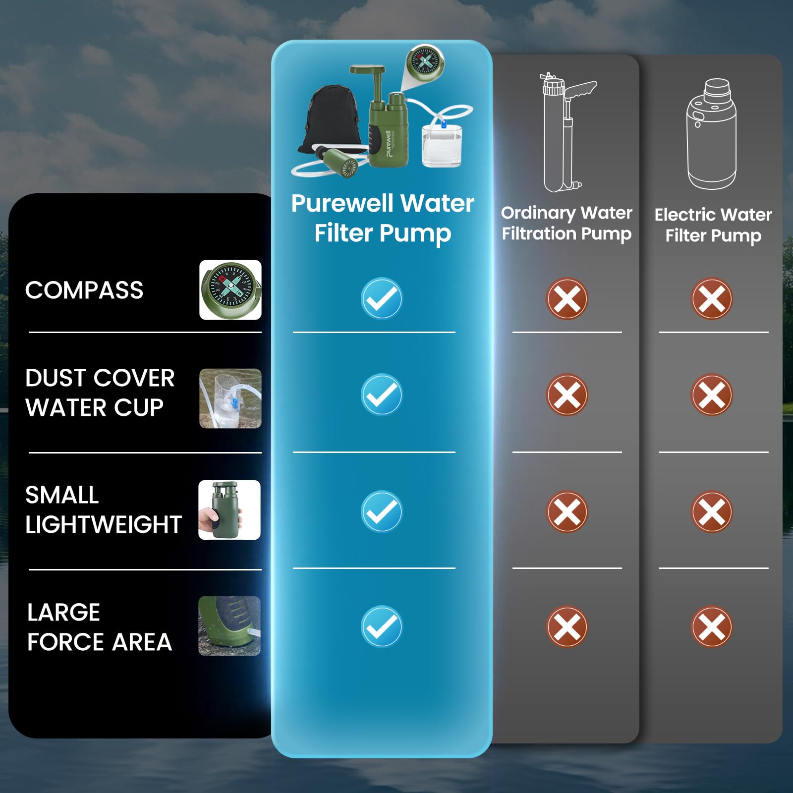 Purewell Water Hand Purifier Pump with Replaceable Carbon 0.01 Micron Water Filter, 4 Filter Stages, Portable Outdoor Emergency and Survival Gear - Camping, Hiking, Backpacking