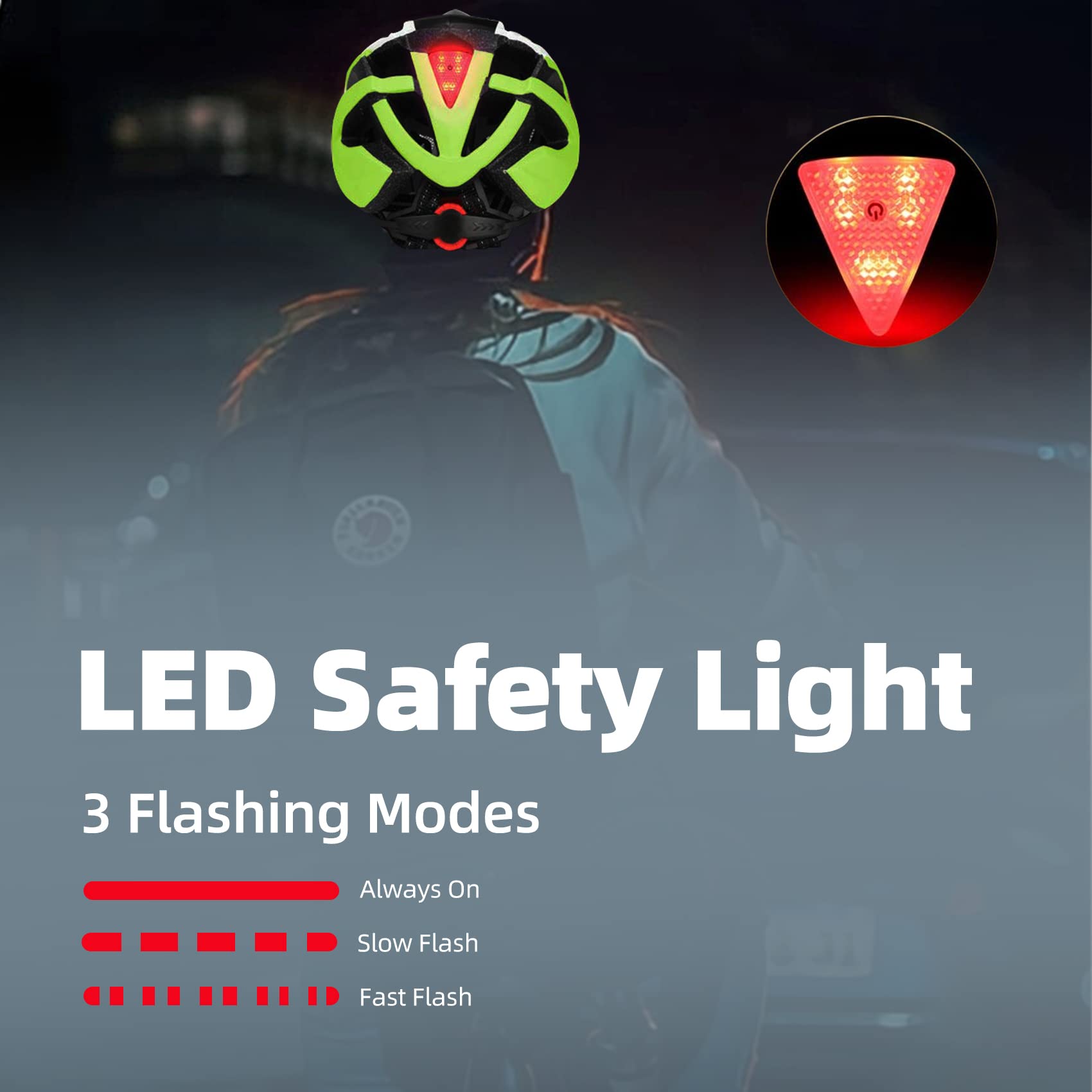 • 🚴‍♀️LED Rear Back Light: Bicycle helmet with LED rear back light includes 3 different lighting modes - steady, slow flashing and fast flashing which can remind other riders or cars behind you to recognize your direction clearly,makes your cycling more safer and brighter at night or in the darkness weather.(An extra replacement battery included as a bonus).