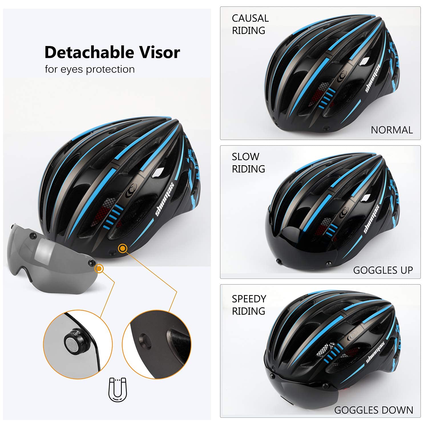• 【Removable Magnetic Goggles UV Protective】Bicycle helmet with a unique magnetic goggles visor shield provides eye protection and blocks the sun and dust perfectly away from your face, UV 400. Your own glasses also can be worn under bike helmet goggles. A helmet meets your 3 wearing needs-goggles up, goggles down and no goggles. Your style bike helmet is designed by yourself.