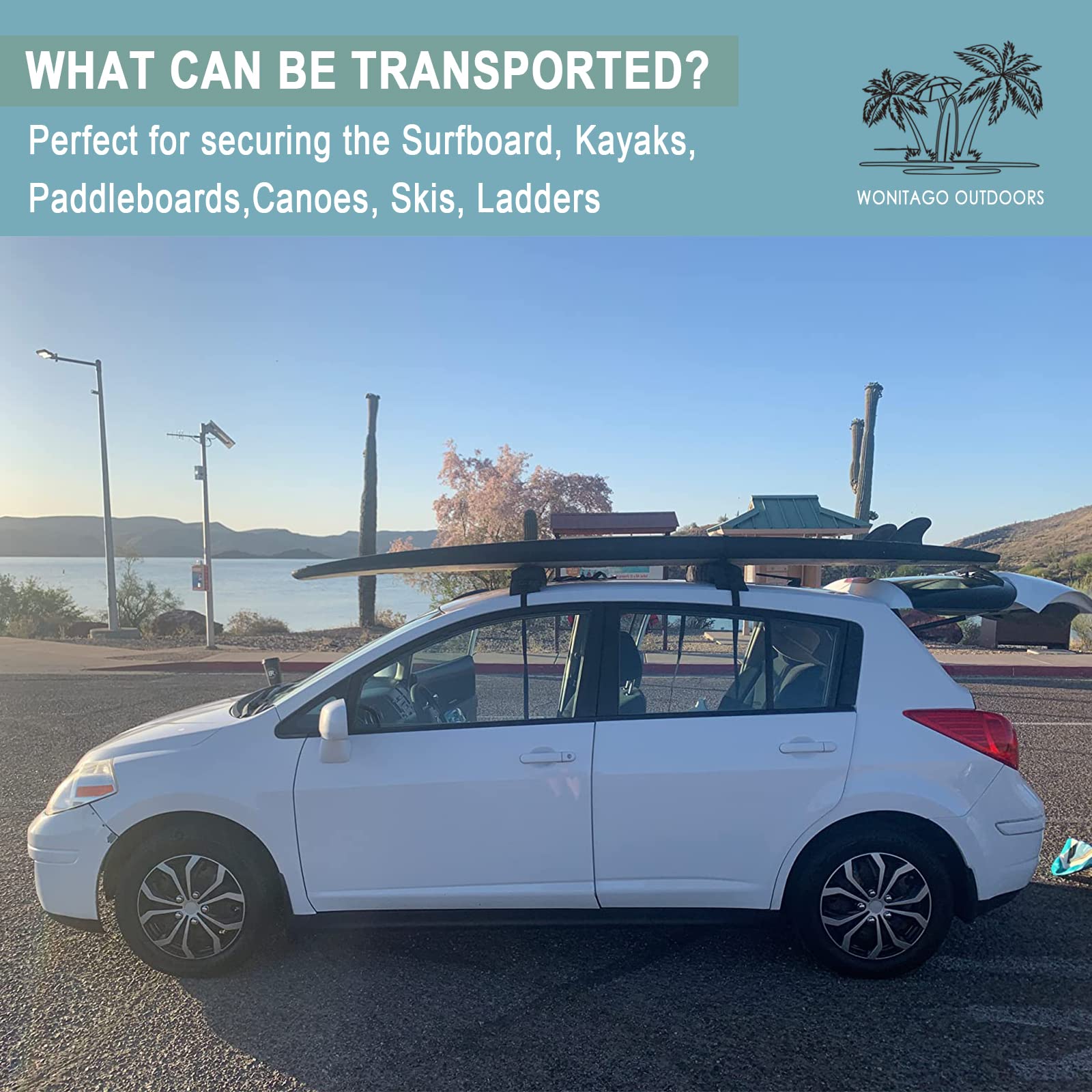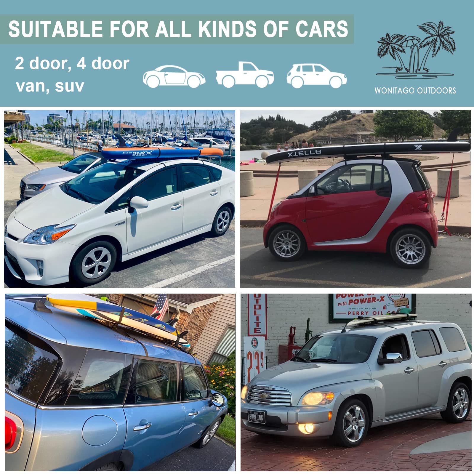 • SUITABLE FOR ALL KINDS OF CARS --- The surfboard racks for car are made with a universal design to fit nearly every vehicle. With 19/28 inch Pads and over 12ft straps, not only a surfboard roof rack, but also a paddleboard, SUP, canoe, skis, and ladders roof rack supporting the long-distance drive