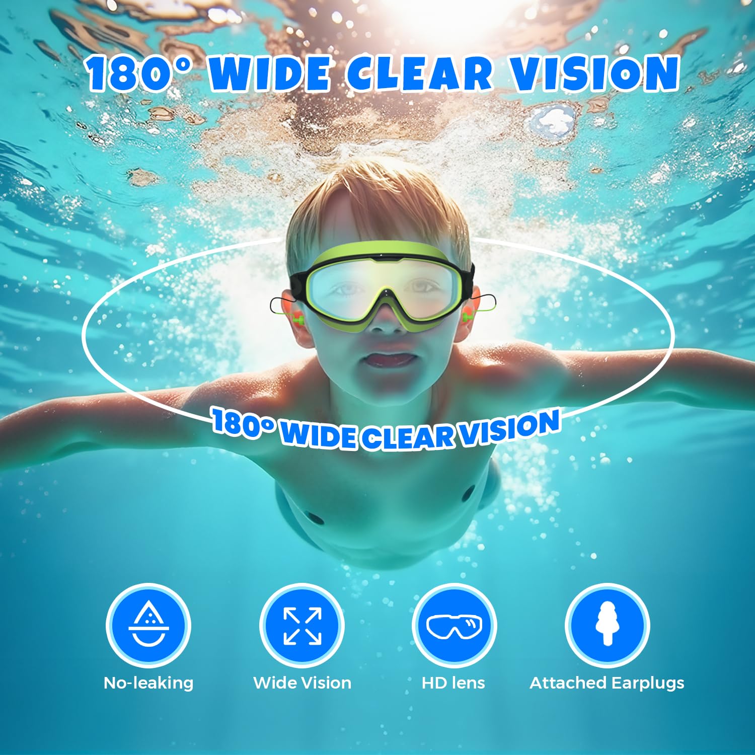 • PANORAMIC VIEW & NO LEAKING: Our swimming goggles are designed with enlarged silicone pads and oversized frames for a 180° better underwater views. The goggles are made of high quality silicone pads, ergonomically designed to ensure a good fit for different face shapes, combining the advantages of swimming goggles and dive masks to provide a better seal and prevent annoying leaks, so that your child can enjoy a leak-free swimming experience.